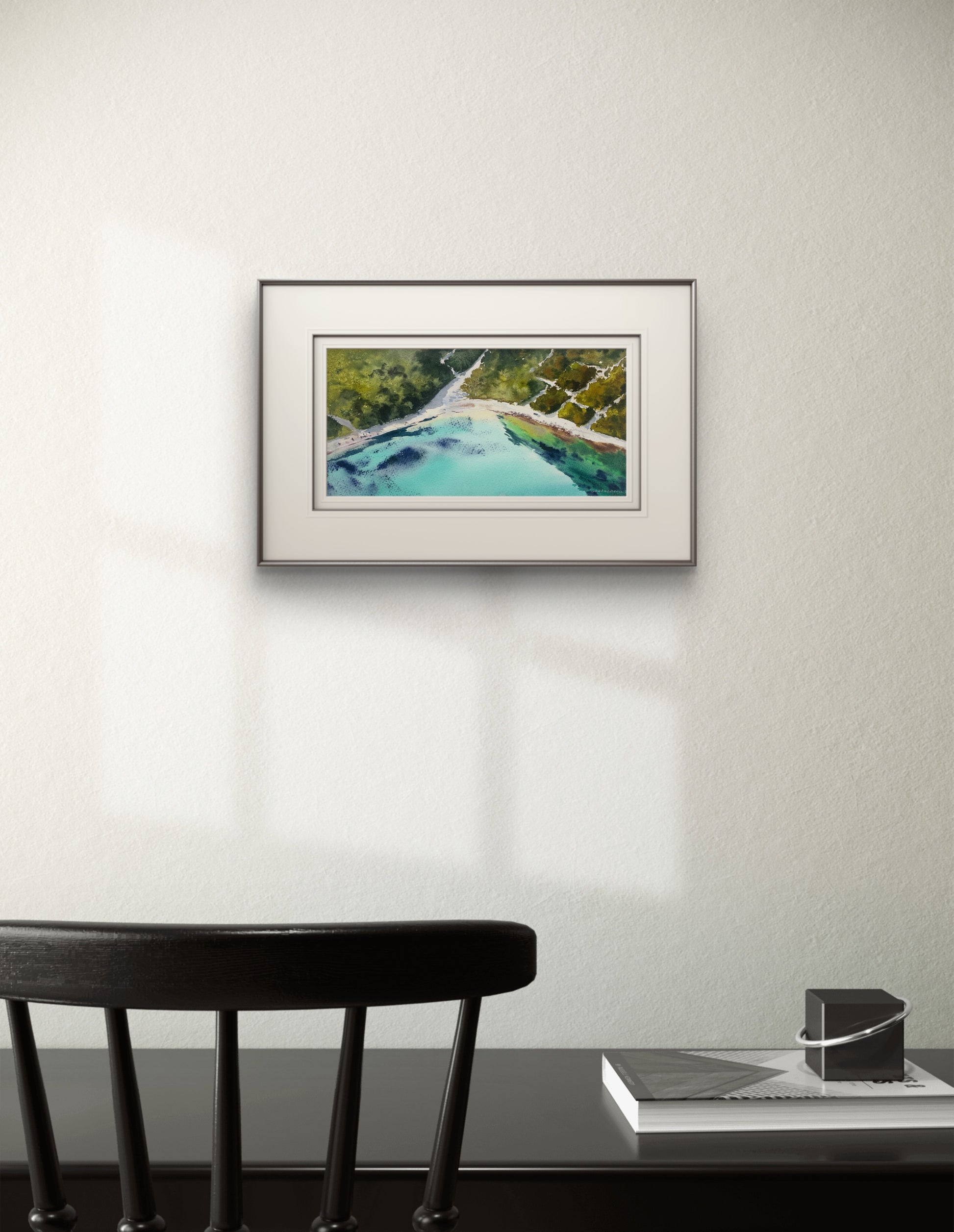 Experience the vibrant beauty of a tropical paradise from a unique bird’s-eye perspective. This original watercolor captures the breathtaking transition from lush green foliage to crystal-clear turquoise waters. The delicate textures of the sandy beach and the movement of the waves create a refreshing, summery atmosphere. Perfect for a coastal-themed home or as a gift for ocean lovers, this hand-painted artwork brings a touch of Mediterranean serenity to any modern space.