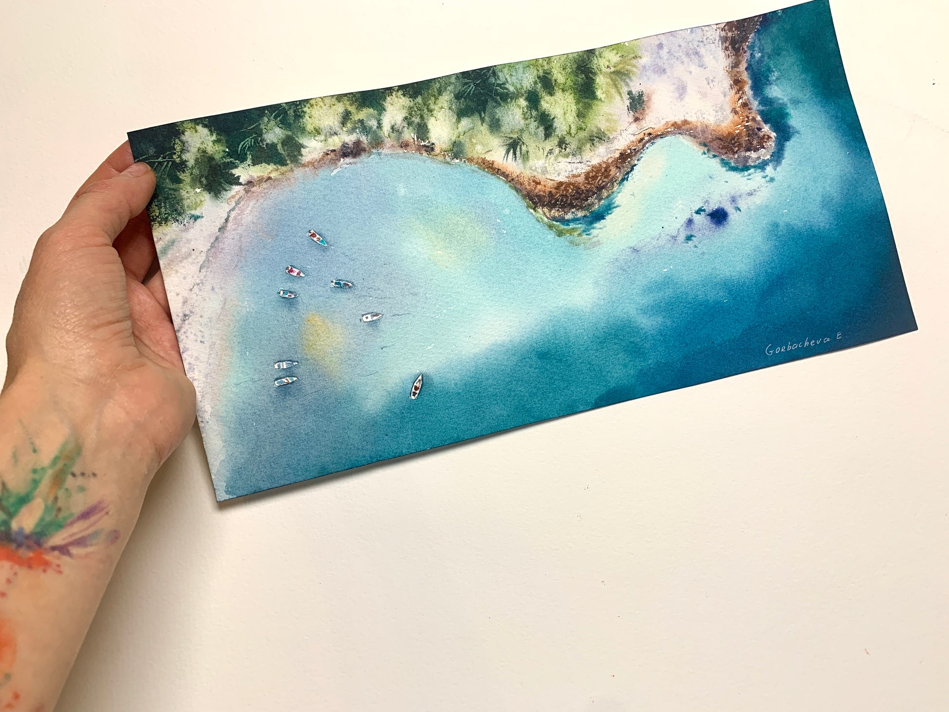 Experience the crystal-clear beauty of a tropical bay from a bird's-eye view. This original watercolor captures the stunning transition from turquoise shallows to deep ocean blues. The delicate details of tiny white boats anchored in the cove and the lush green coastline create a sense of ultimate summer serenity. Perfect for a coastal-themed bathroom, a bright living room, or a vacation home. Hand-painted on archival paper, this piece brings a refreshing ocean breeze to your walls.