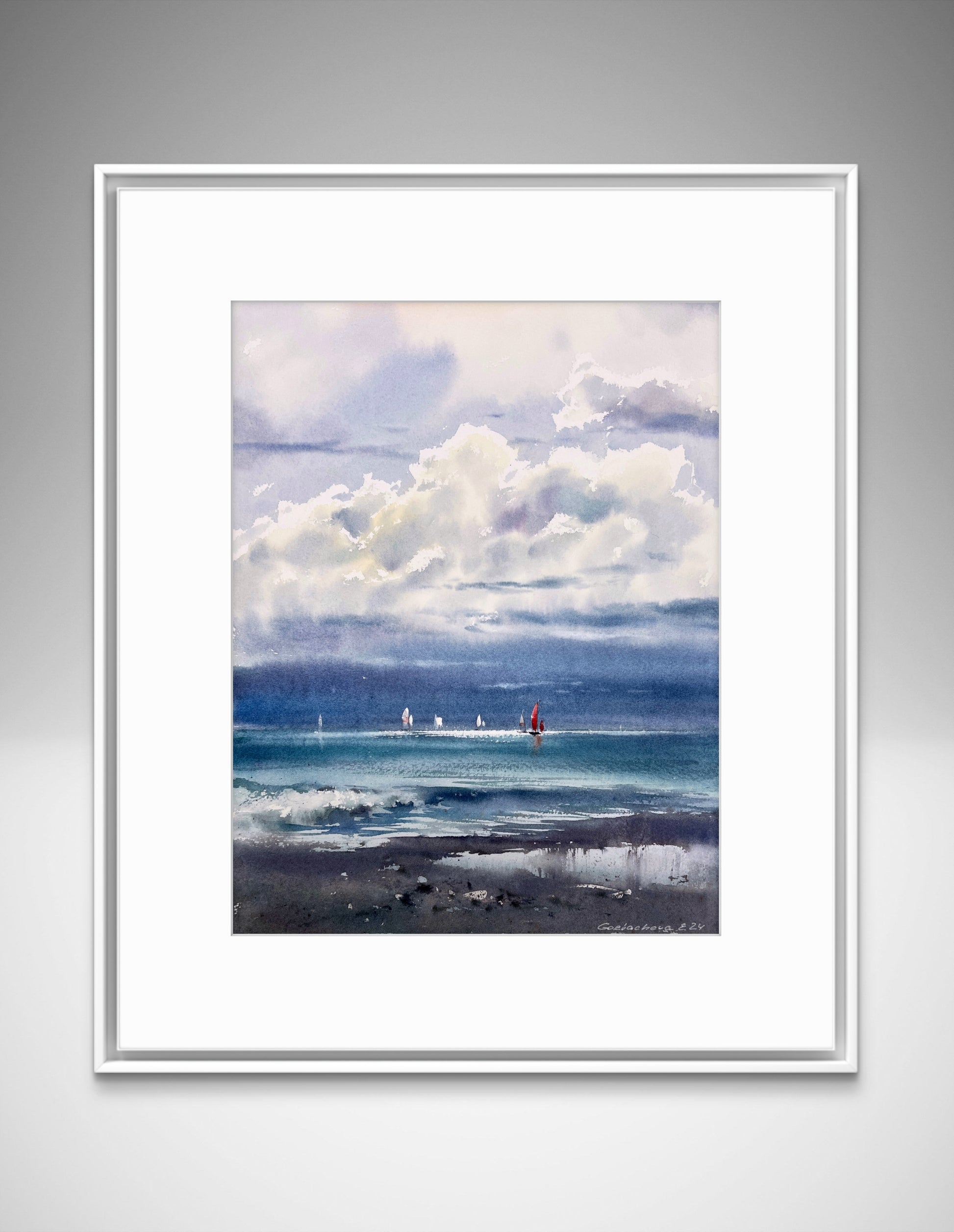 Introducing my original watercolor painting Kingdom of the Clouds #2 which captures the serene beauty of a coastal landscape. In this piece, fluffy clouds delicately float above a picturesque coastline, with elegant yachts drifting in the background. The soothing color palette and soft brushstrokes create a sense of tranquility, making it a perfect addition to any art collection. Bring a touch of coastal charm into your space with this unique watercolor artwork.