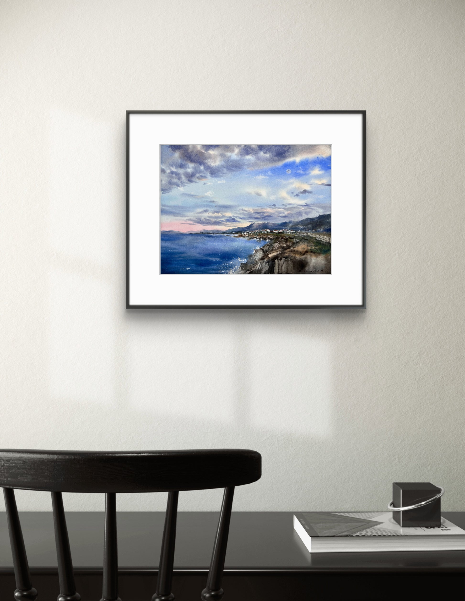 Elevate your home interior with this stunning Cyprus seascape watercolor. Featuring crashing waves, a misty mountain range, and charming white-roofed houses, this painting brings the tranquil yet powerful energy of the sea into your space. It is hand-painted on professional-grade paper, ensuring vibrant colors and longevity. Whether you are looking for a unique Christmas gift or a centerpiece for your coastal-themed gallery wall, this original Mediterranean landscape is a timeless choice.
