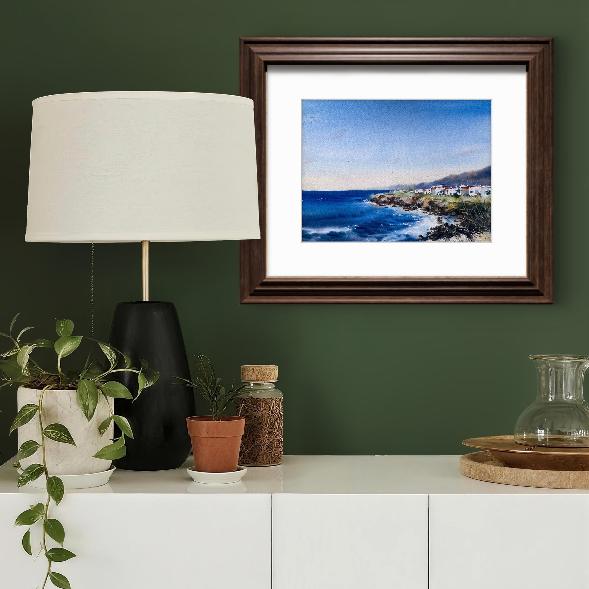 A hand-painted watercolor artwork inspired by the Cyprus coastline. Rich blue tones of the sea contrast beautifully with rugged cliffs and traditional coastal architecture, capturing the authentic Mediterranean landscape. Expressive brushstrokes and subtle details convey movement, light, and tranquility. Ideal wall art for coastal interiors, nautical decor, or as a meaningful gift for ocean lovers and travel enthusiasts. This painting brings the relaxed spirit of Cyprus into your living space.