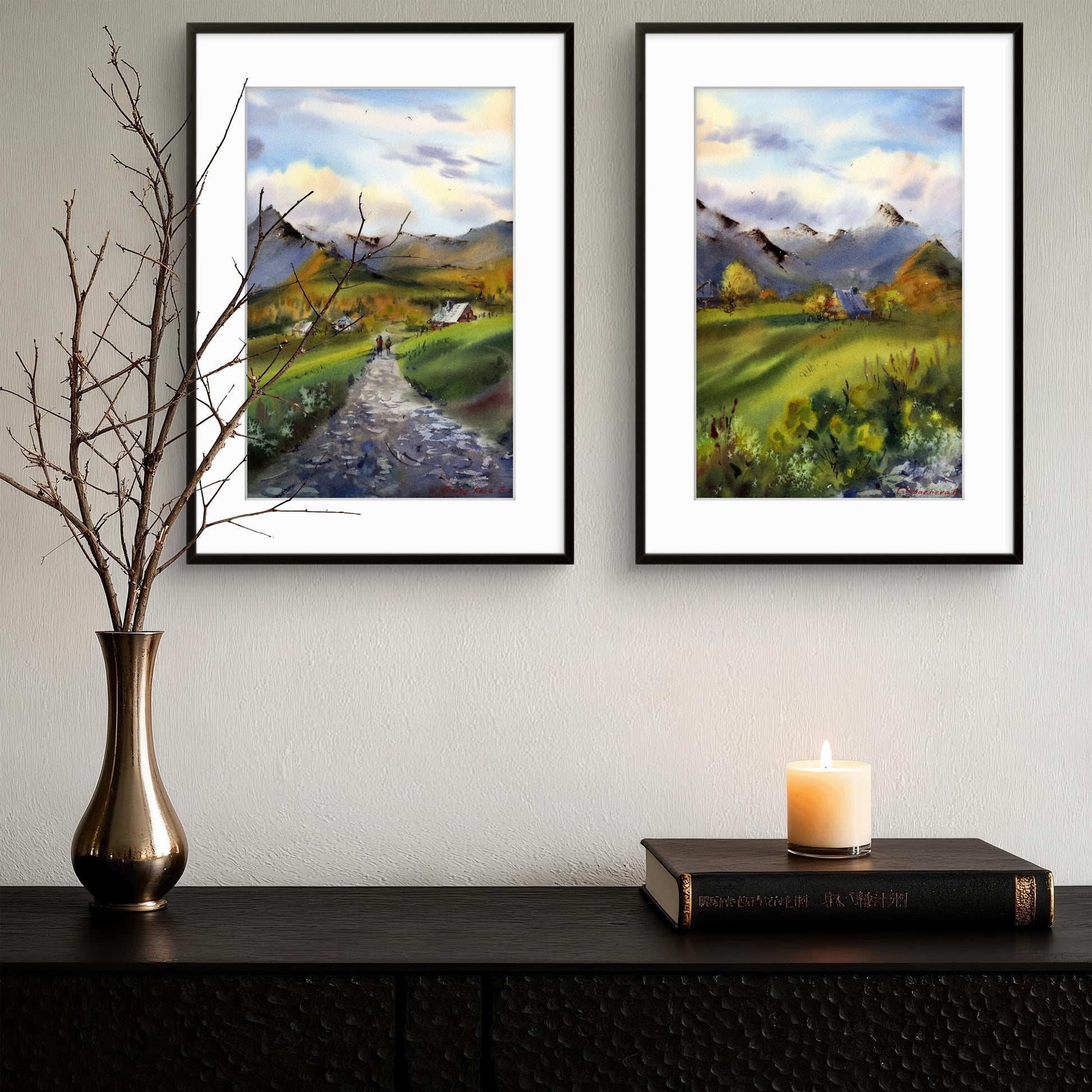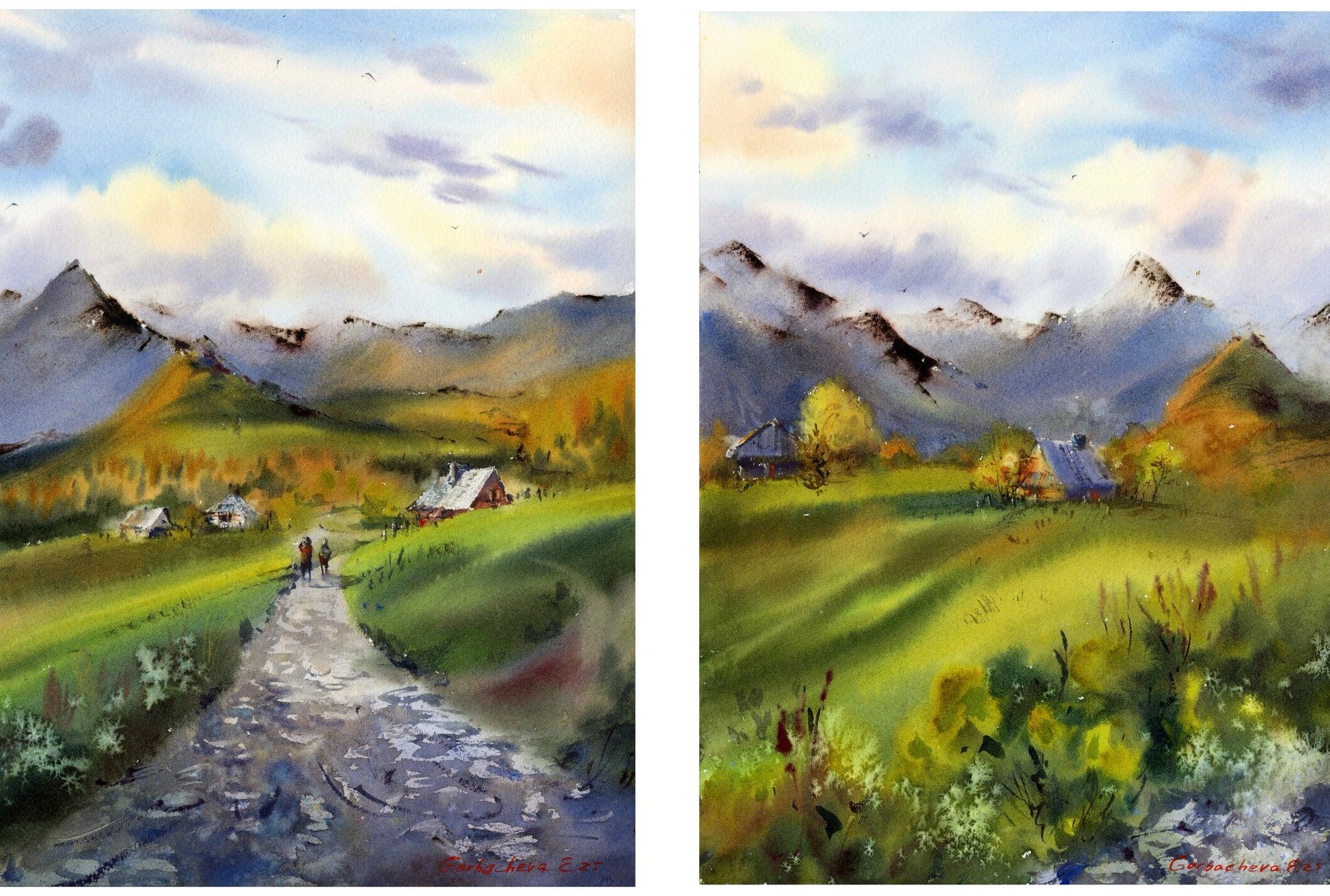 This stunning original watercolor, titled "Morning over the Tatras," brings the fresh, crisp air of the mountains into your space. The composition draws the eye along the rugged path towards cozy rural cottages nestled in the vibrant green valley. The hazy autumn colors and dramatic, fog-kissed peaks capture the true beauty of the Carpathian landscape. Perfect for adding a touch of rustic charm to your living room or study, and an excellent, memorable Christmas gift.