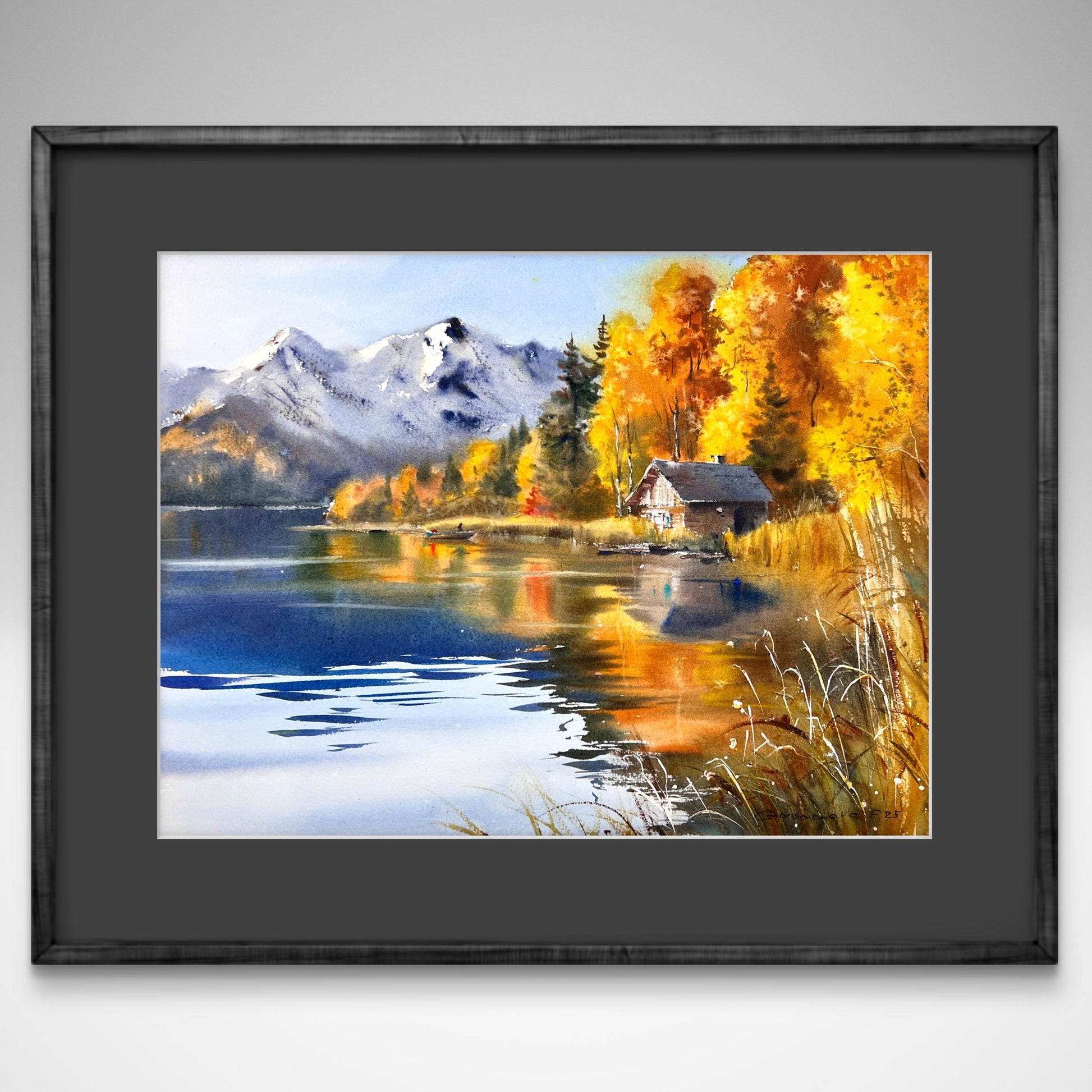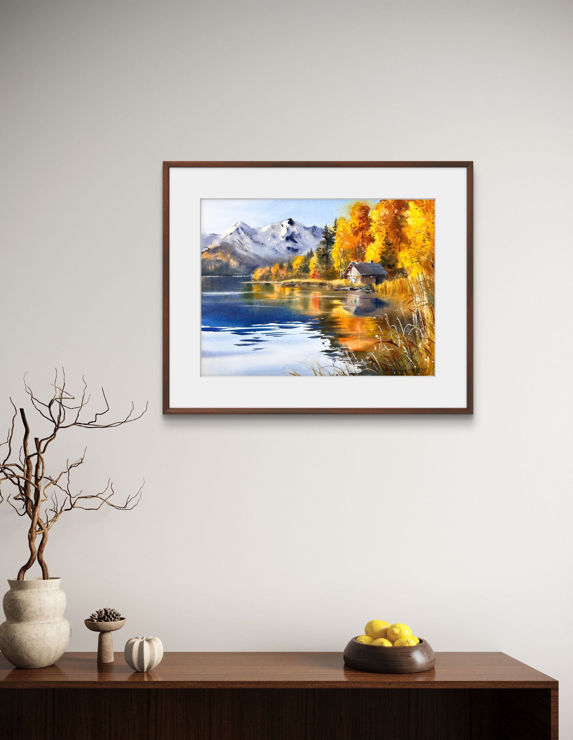 Experience the contrast of snow and fall color. This original artwork or print features an idyllic alpine landscape, with a dark wooden log cabin nestled among brilliant yellow and orange trees. The deep blue lake and white mountain tops create a powerful, serene composition. An essential piece of wilderness fine art.