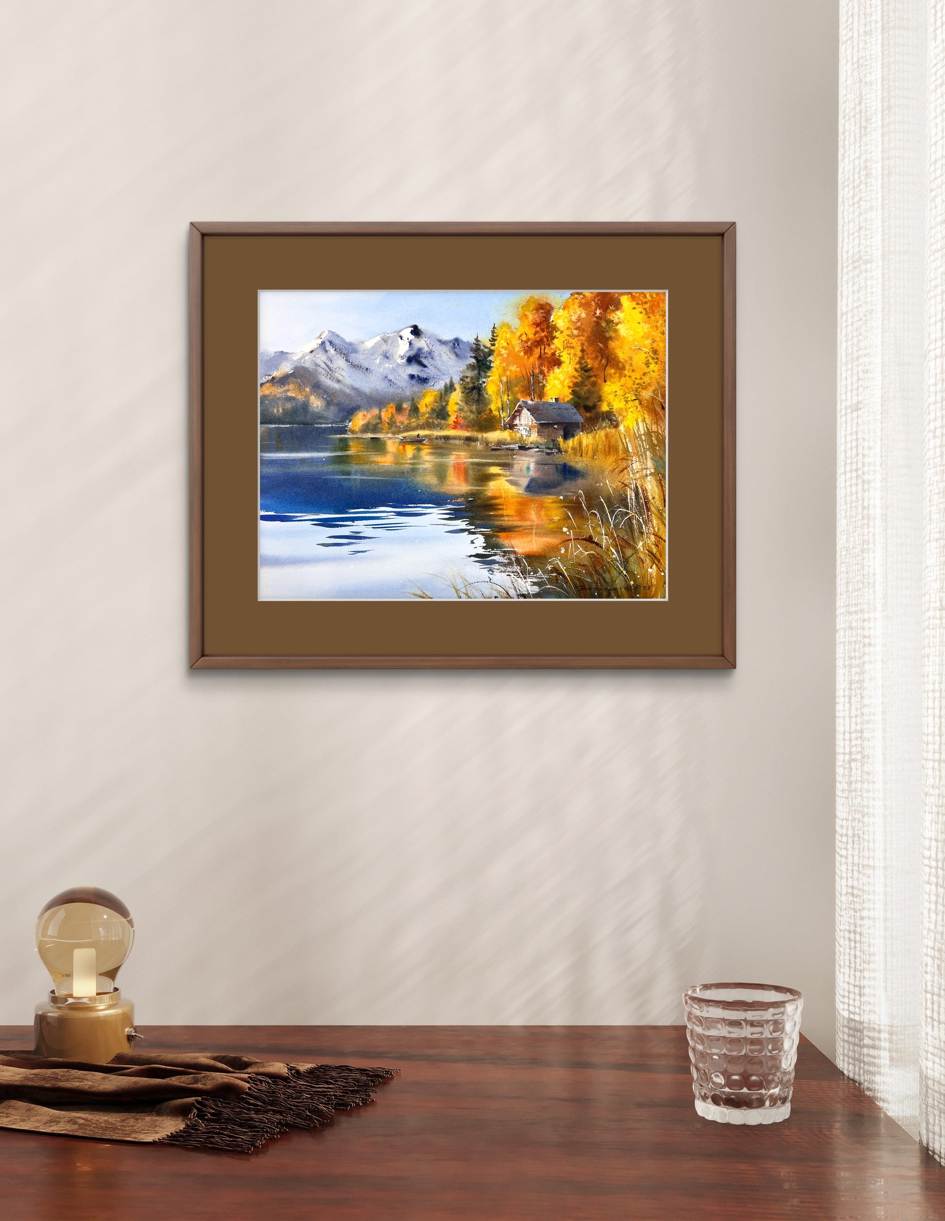 Original Autumn Mountain Lake Watercolor Painting, Mountain Solitude 12x16 in