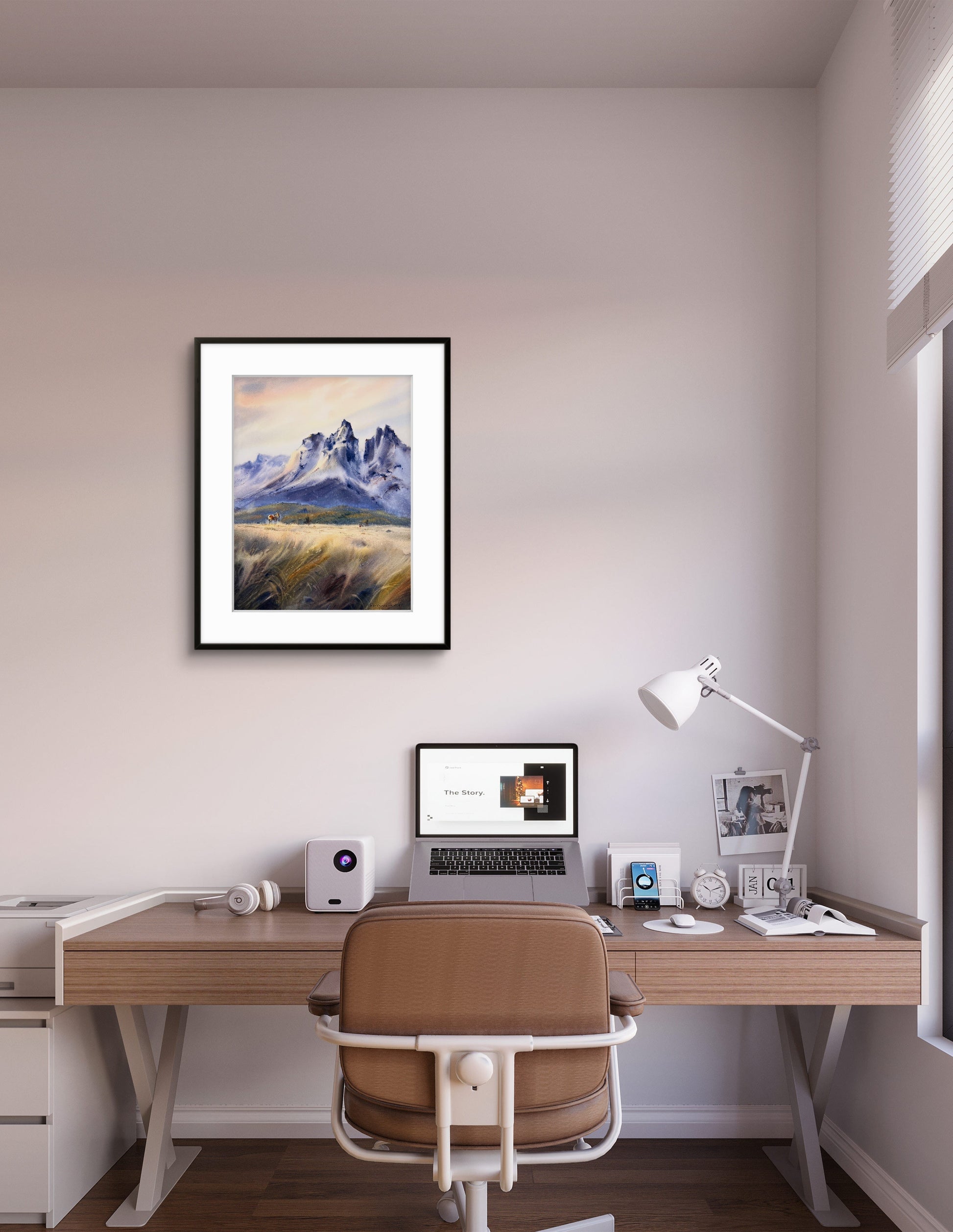 This expansive landscape offers a grand view of mountains and field. The artist's signature technique captures the soft light and texture found in high-altitude environments. Investing in this original piece brings the unique vision and skill of a sought-after contemporary artist into your home.