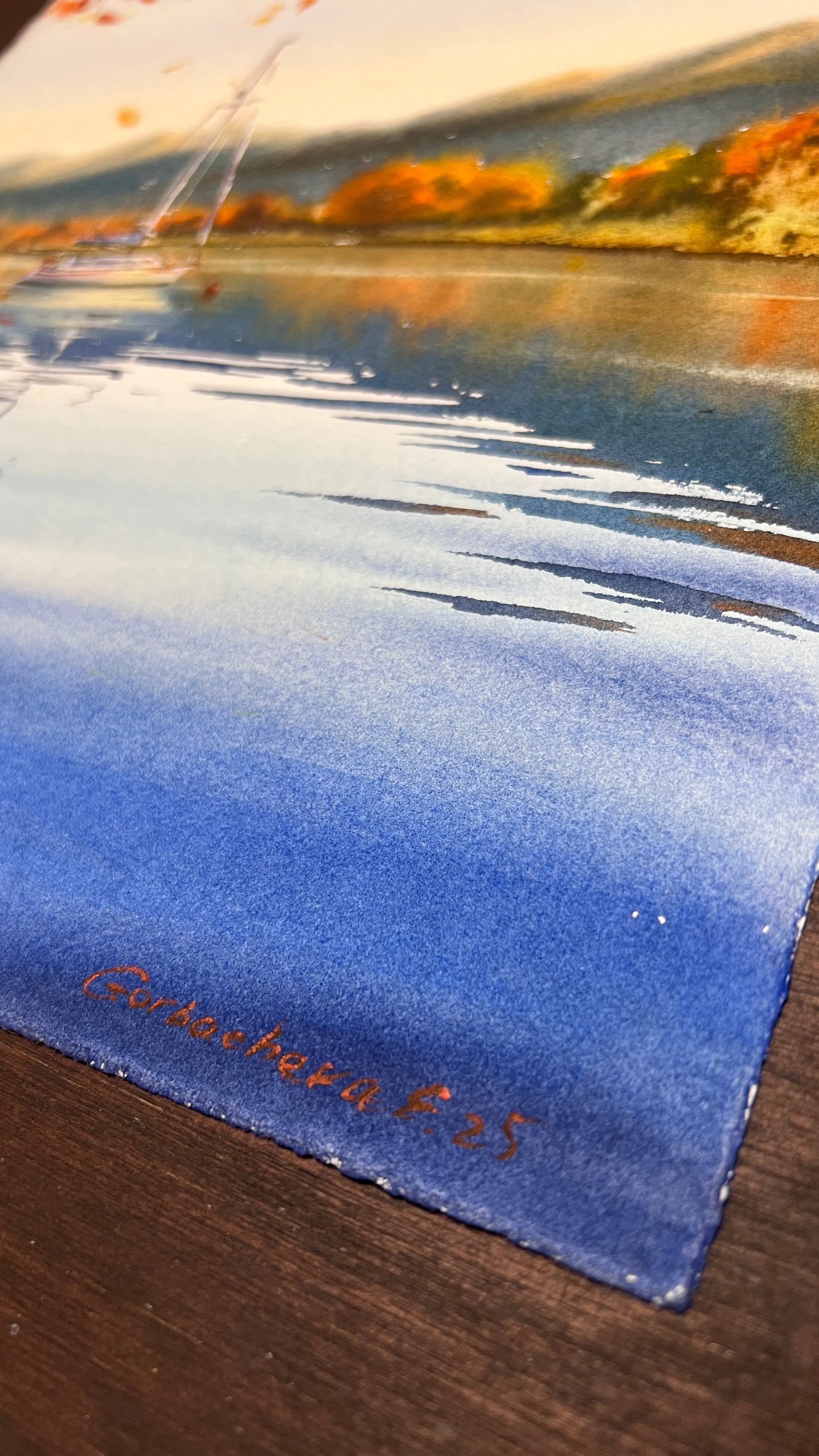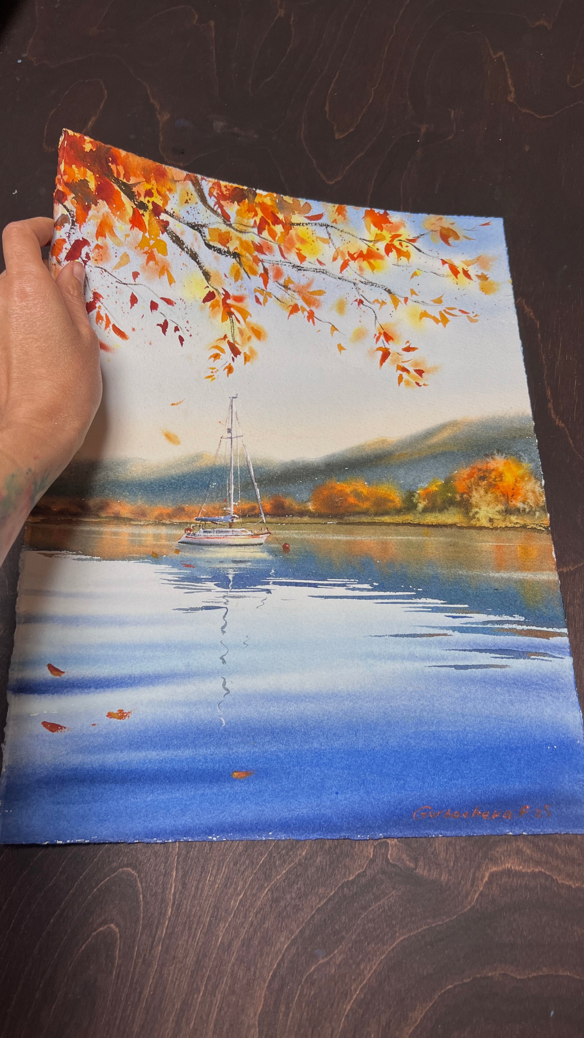 Original watercolor art, measuring 28x38 cm, making a bold statement as Fall Wall Decor. This painting features a classic nautical subject—a lone sailboat—set against a stunning Autumn Landscape. The artist's use of fluid watercolor techniques creates rich, deep blues in the water and a dazzling array of warm orange and yellow in the foliage. The fine detail on the boat contrasts beautifully with the soft washes of the background mountains, highlighting the feeling of depth and space.