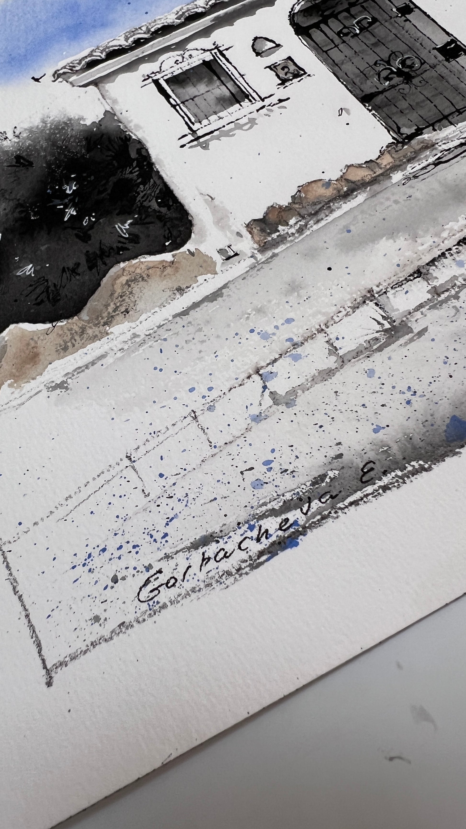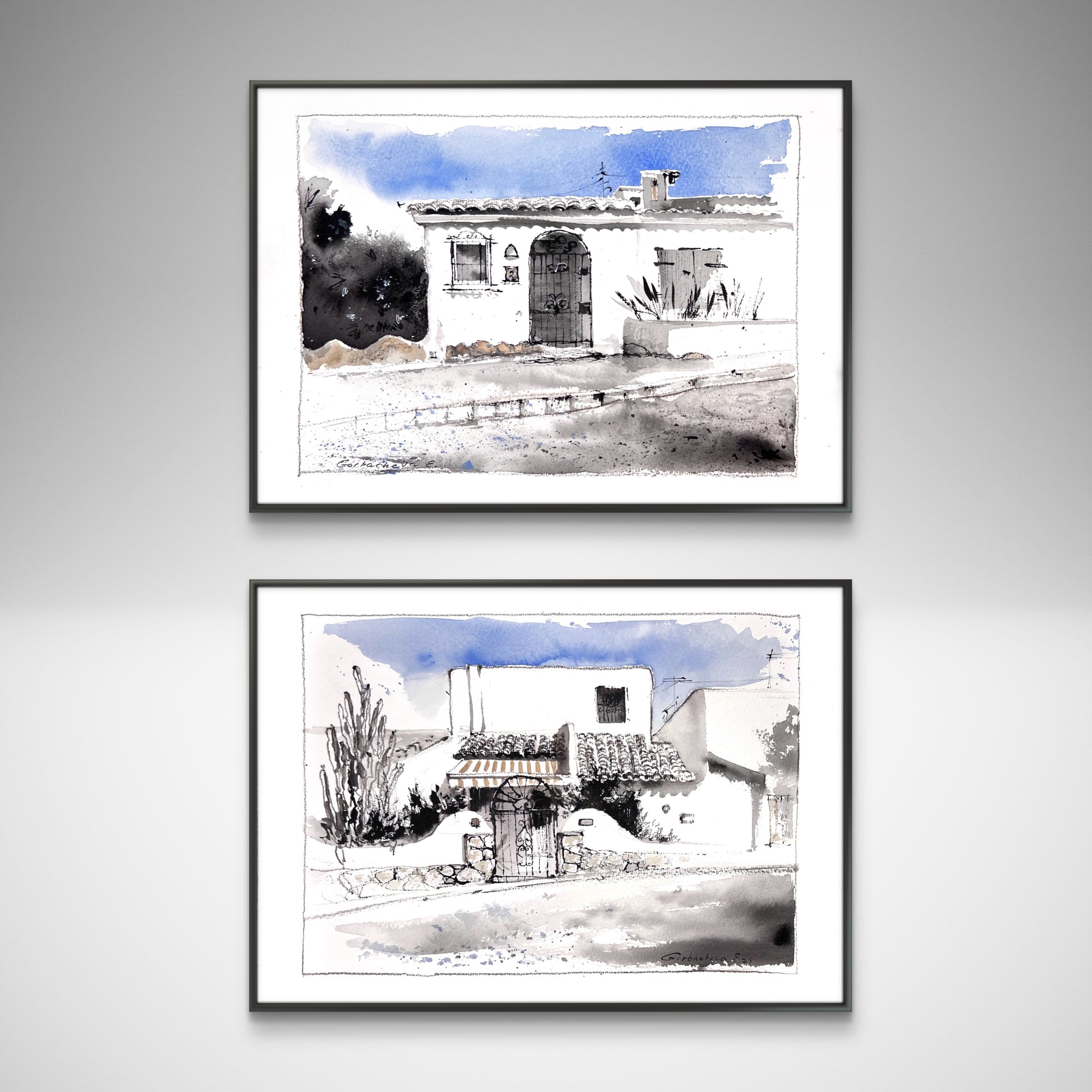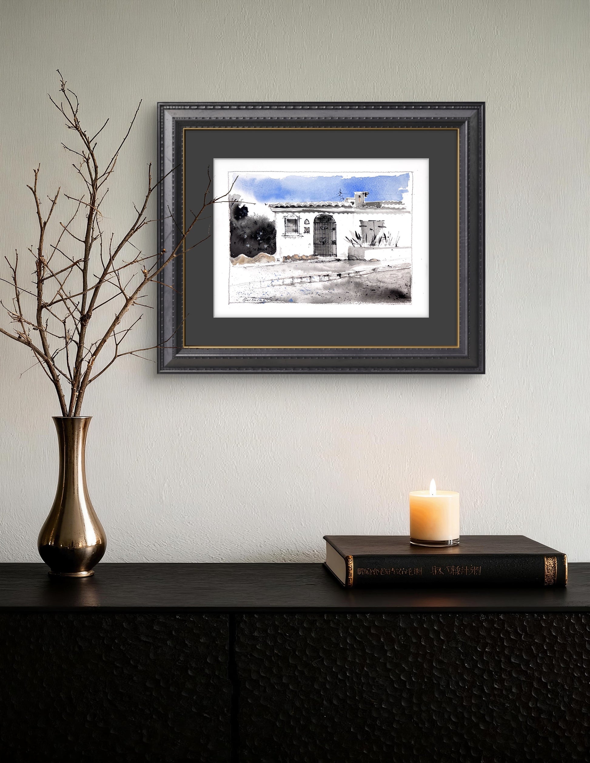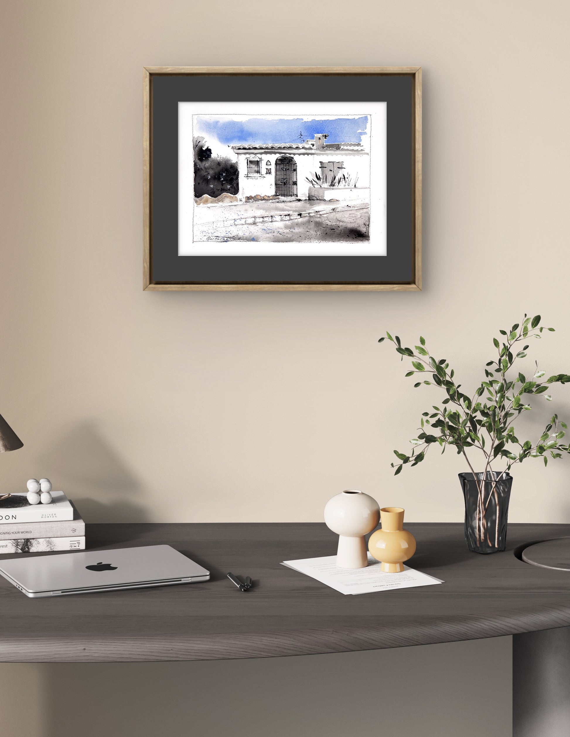 This expressive watercolor is a perfect gift for the holidays. Titled "Door to Spanish Silence," it features a classic rustic Spanish door and a whitewashed facade, rendered in a striking line and wash style. The contrast of the dark door and the vibrant blue sky suggests a momentary quiet under the bright sun. Ideal for Mediterranean or Bohemian home decor, this original work brings a piece of Southern Europe to your space. A unique and memorable Christmas gift.