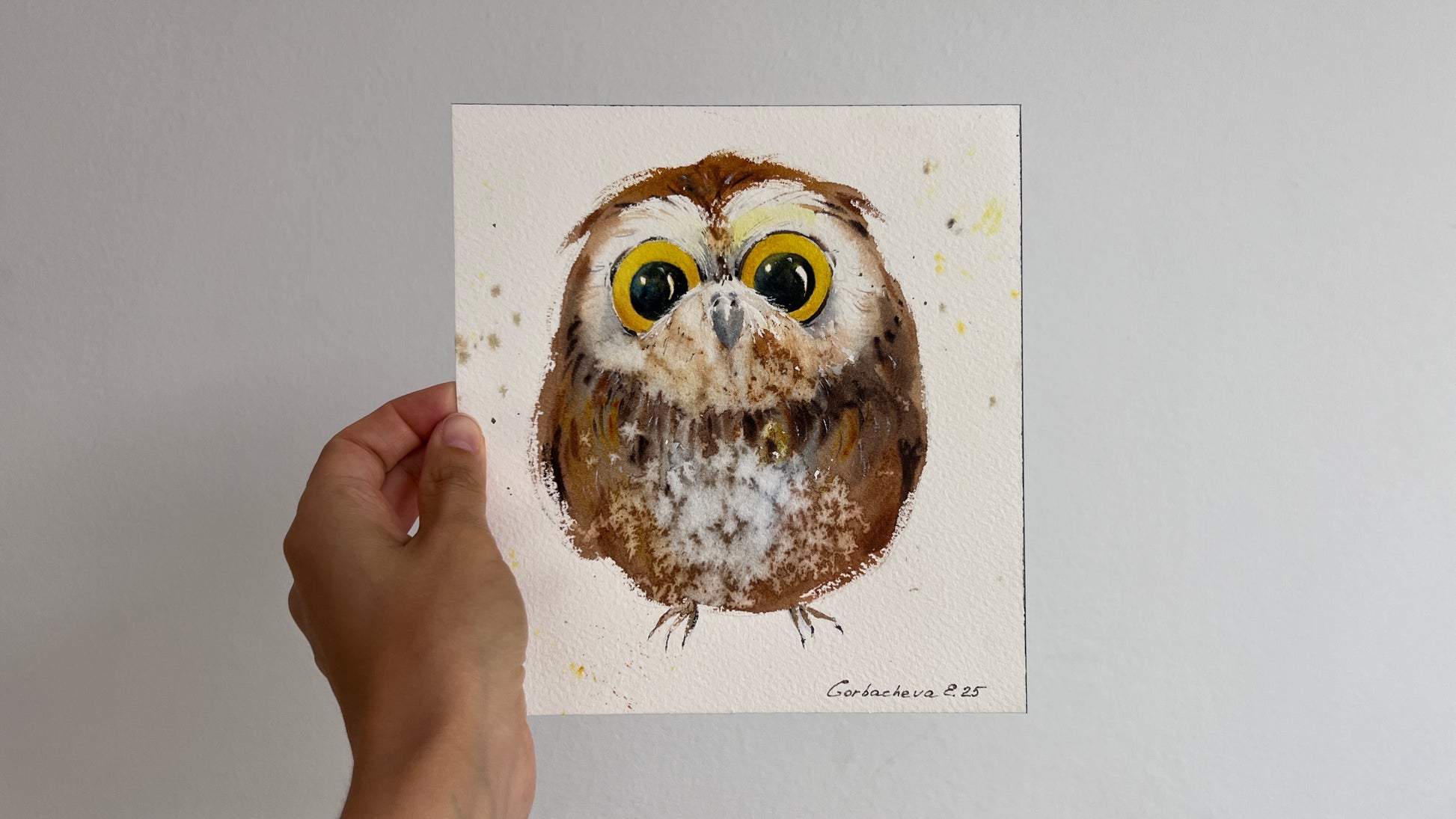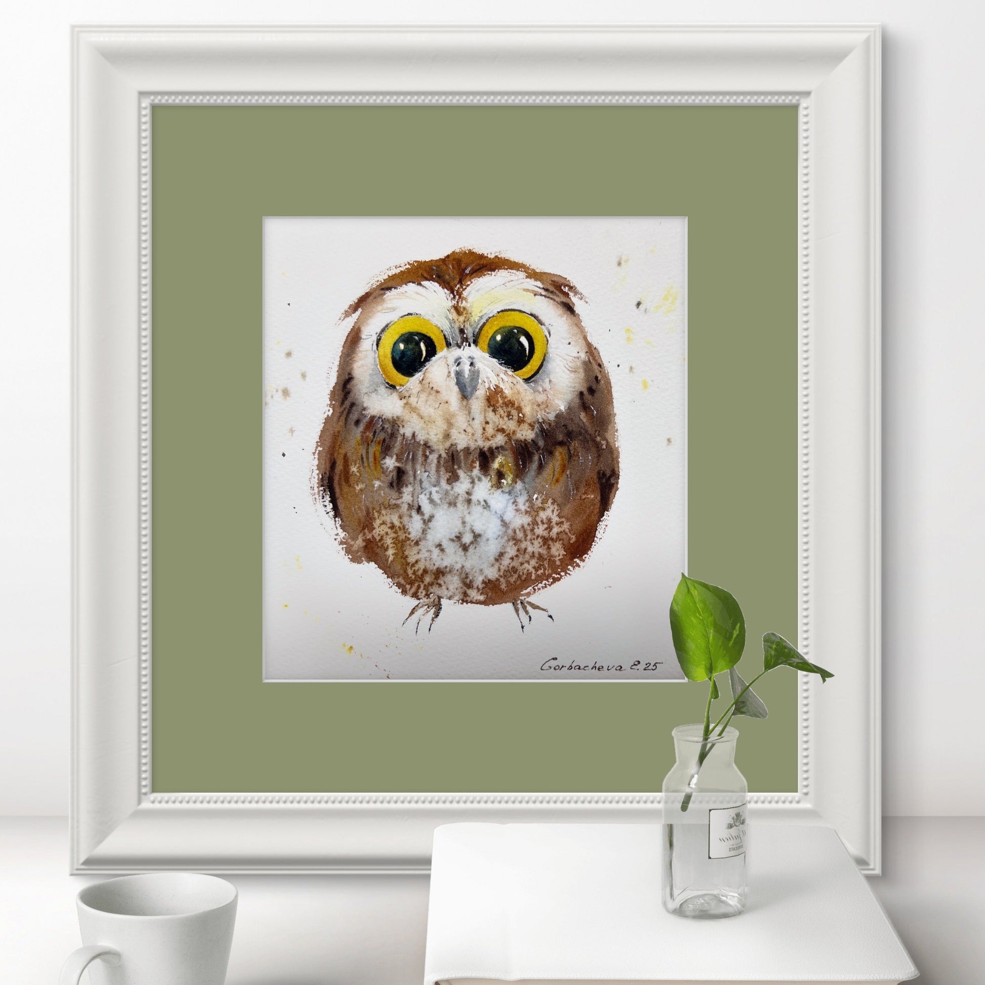 Original Watercolor Painting Tiny Owl, Cute Baby Owl Art, Charming owlet 7x7 in