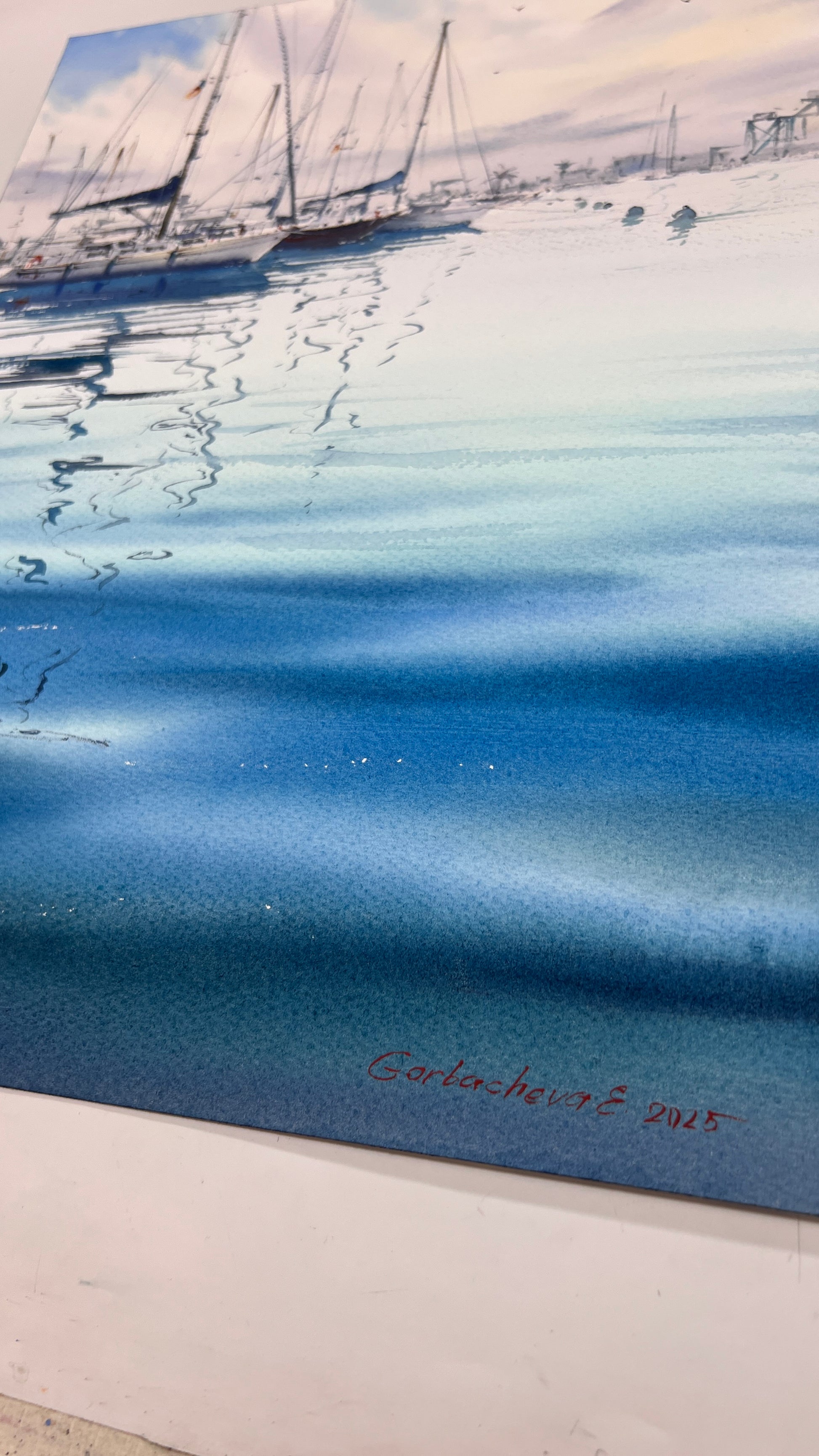 Start your day with the calm elegance of "Yachts in the Morning Haze", an original watercolor painting that captures the serene beauty of a coastal morning. Gentle tones, soft reflections, and minimalist brushwork evoke a peaceful nautical atmosphere — perfect for bringing light and tranquility into any coastal or modern living space. Hand-painted on high-quality, acid-free watercolor paper, this unique piece makes an ideal gift for sailing enthusiasts, beach house owners, or lovers of refined maritime decor.