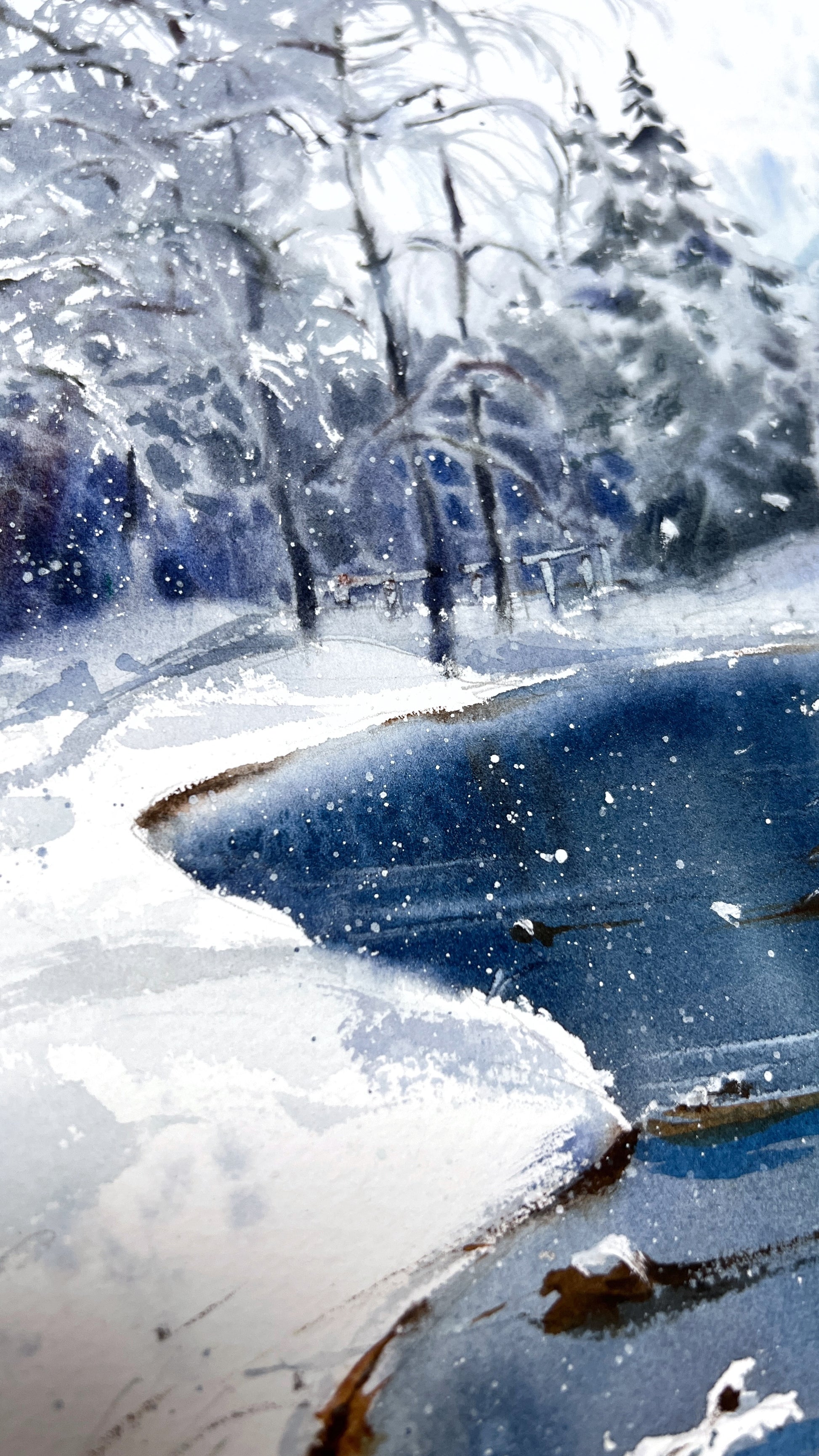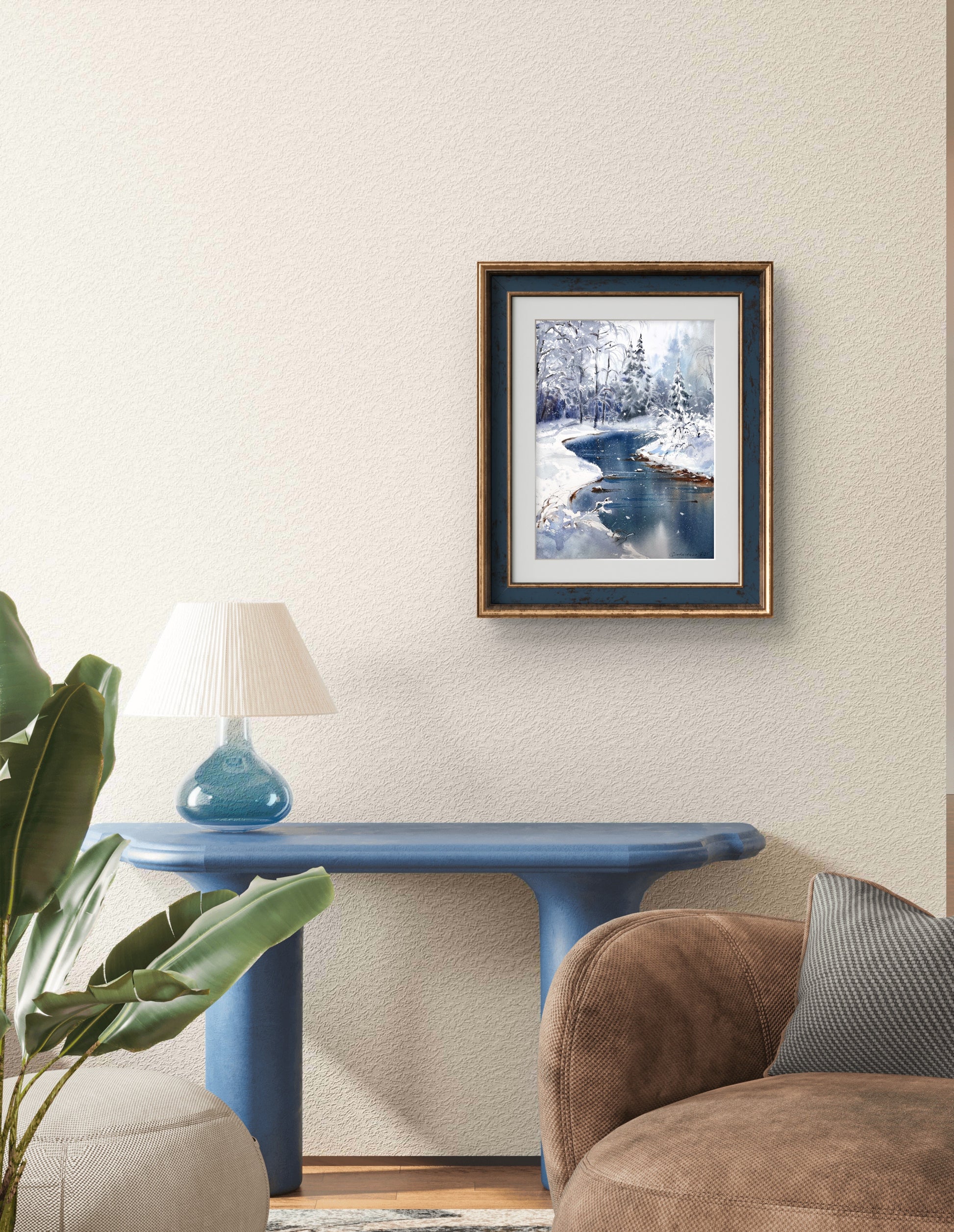 This original winter watercolor captures the peaceful essence of a snowy forest. A deep blue river winds through frost-covered trees, creating a calm and serene atmosphere. Hand-painted with high-quality pigments, this piece brings the quiet beauty of a winter morning into your home. It is an ideal addition to a cozy living room or a bedroom gallery wall. Perfect for those who love the stillness of nature and the crisp magic of the first snowfall.