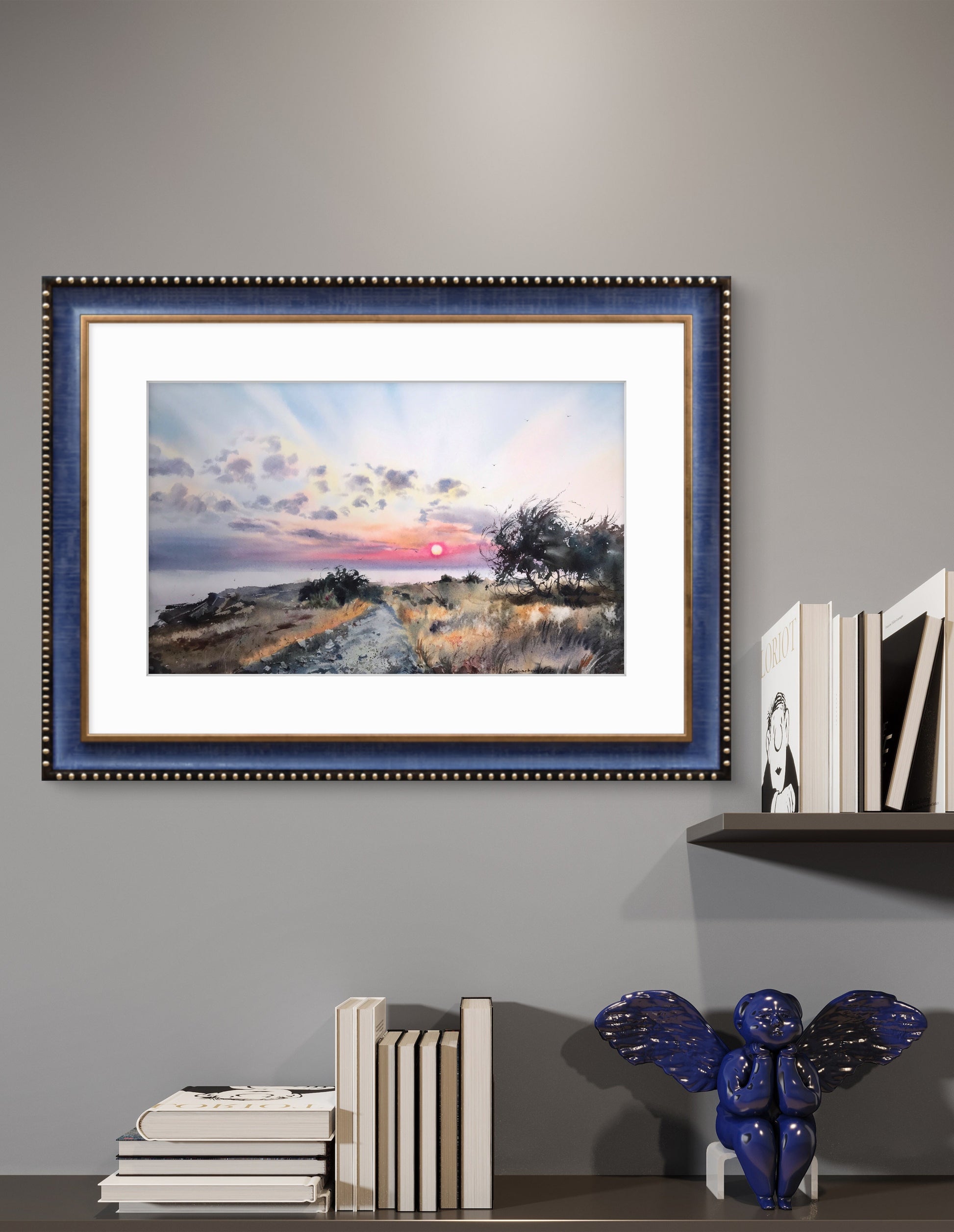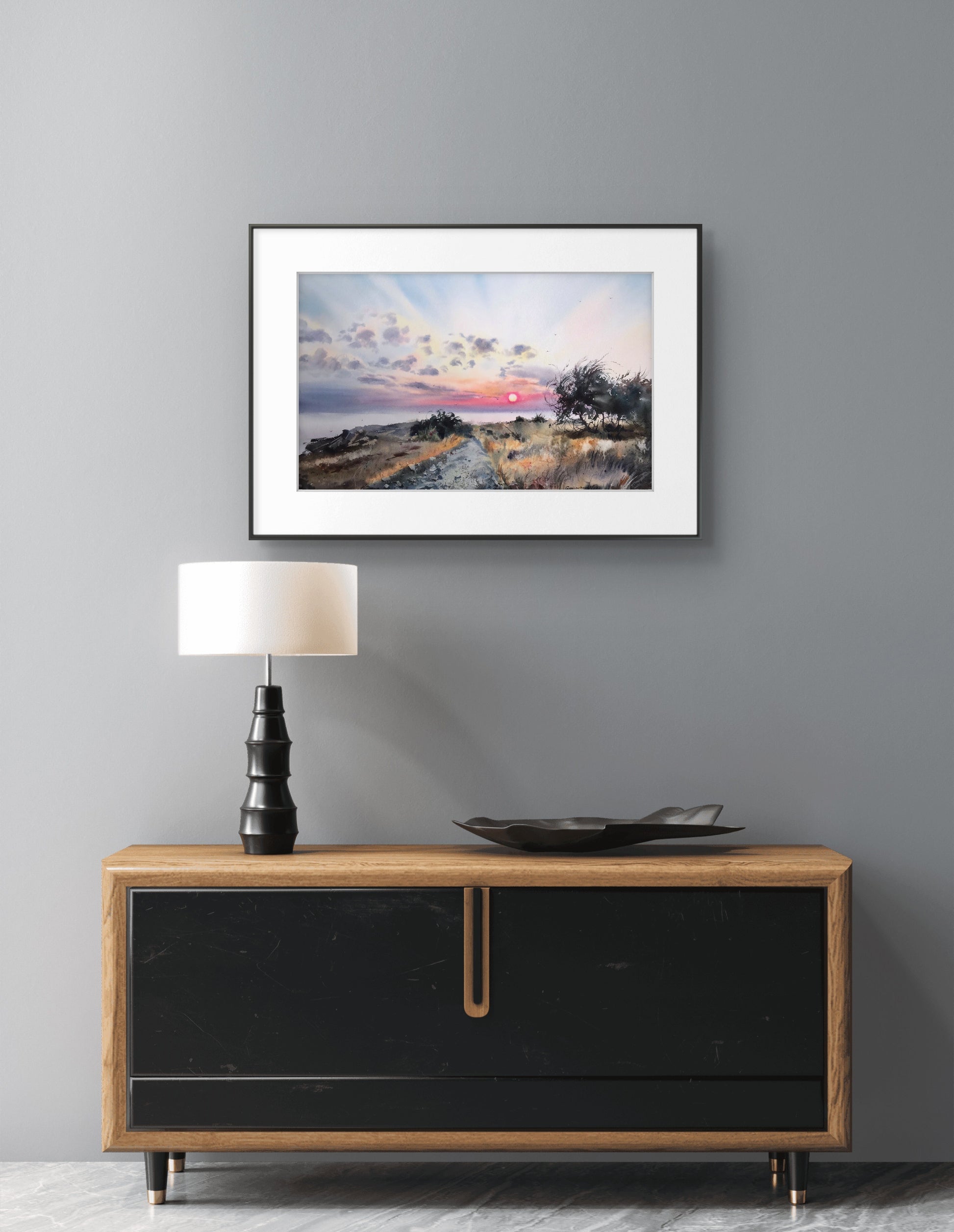 Immerse yourself in the calming beauty of the sea with our stunning Seascape Painting Watercolor Original "Sunset on the Sea Cyprus." This exquisite piece of coastal wall art is a 13 x 22-inch original watercolor painting that captures the serene beauty of a sunrise over the Mediterranean Sea in Cyprus. The soft hues of dawn, the gentle waves lapping against the shore, and the subtle reflections on the water are perfectly portrayed, creating a tranquil scene that will transport you to a peaceful coastal retreat every time you look at it.