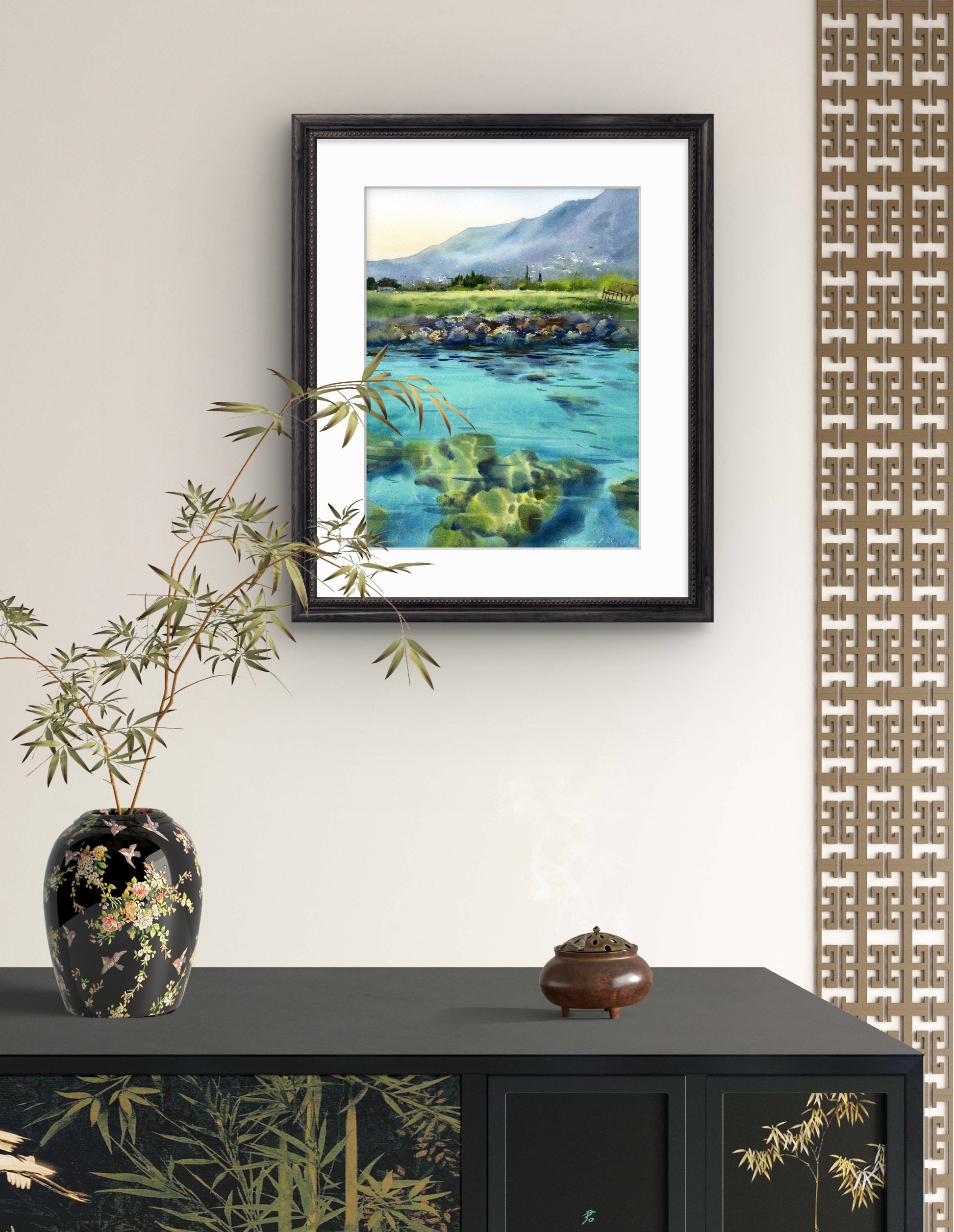 Bring the tranquility of the sea into your space with this stunning original watercolor painting On the Sea Coast #4. The realistic seascape captures the beauty of the ocean in vibrant green and blue colors. Perfect for adding a calming touch to any room.