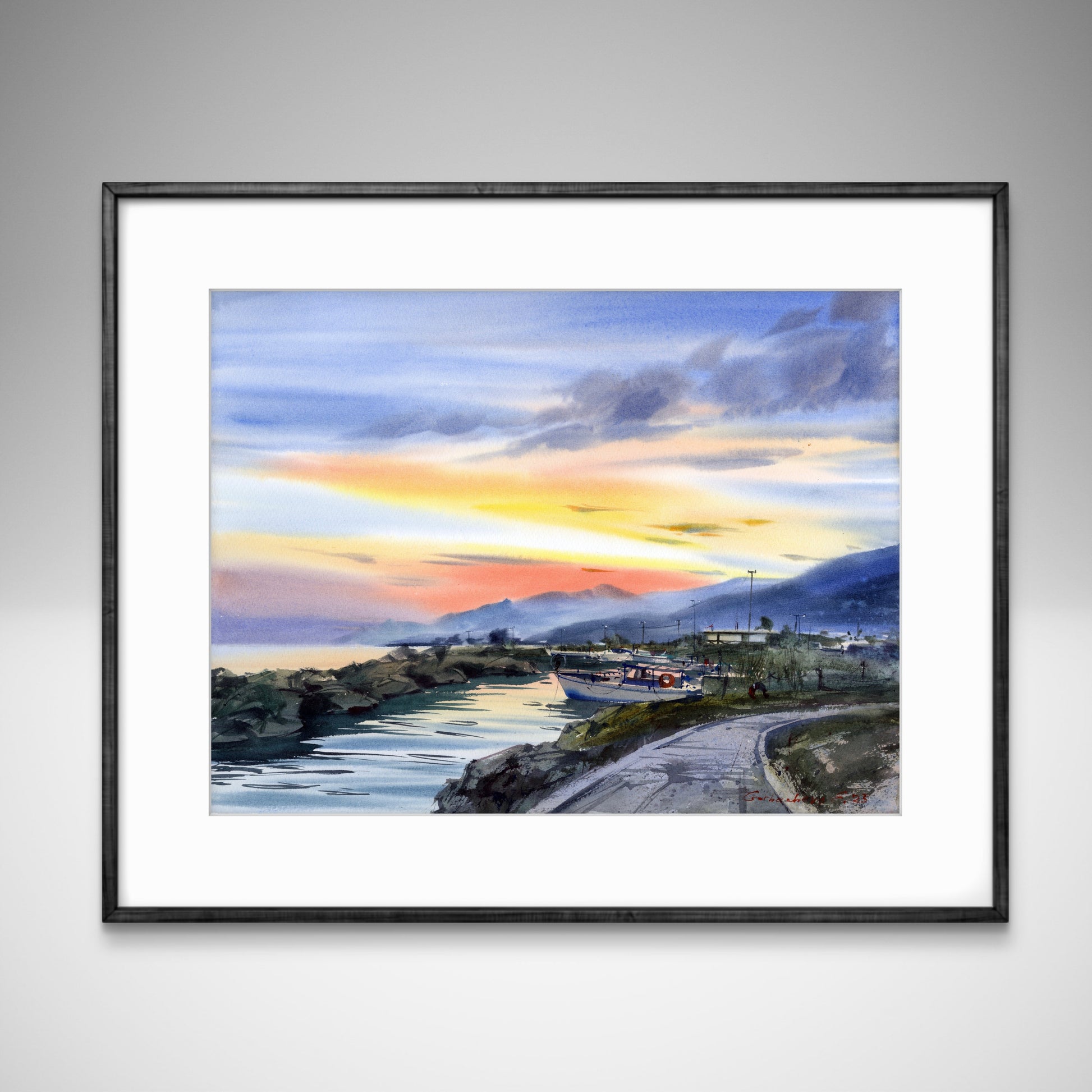 Add a gem to your art collection with this original landscape. This piece perfectly balances realism with the fluid, spontaneous nature of watercolor. The depiction of the harbor infrastructure against the raw beauty of a sunset sky creates a compelling narrative of human life meeting nature. The artist’s signature adds value to this unique work. It is not just a painting, but a captured moment of light and atmosphere that will appreciate in sentimental and aesthetic value over time.