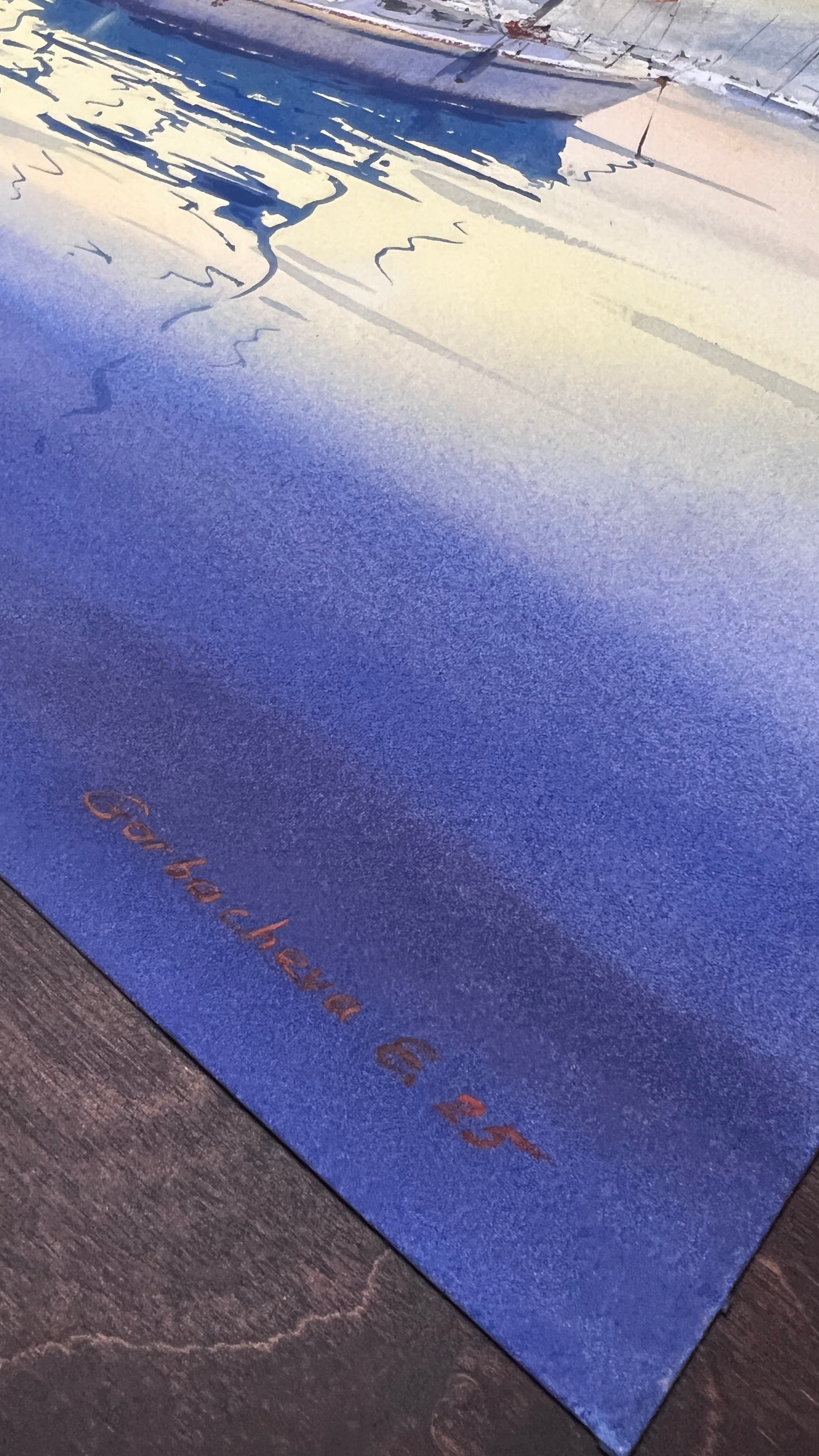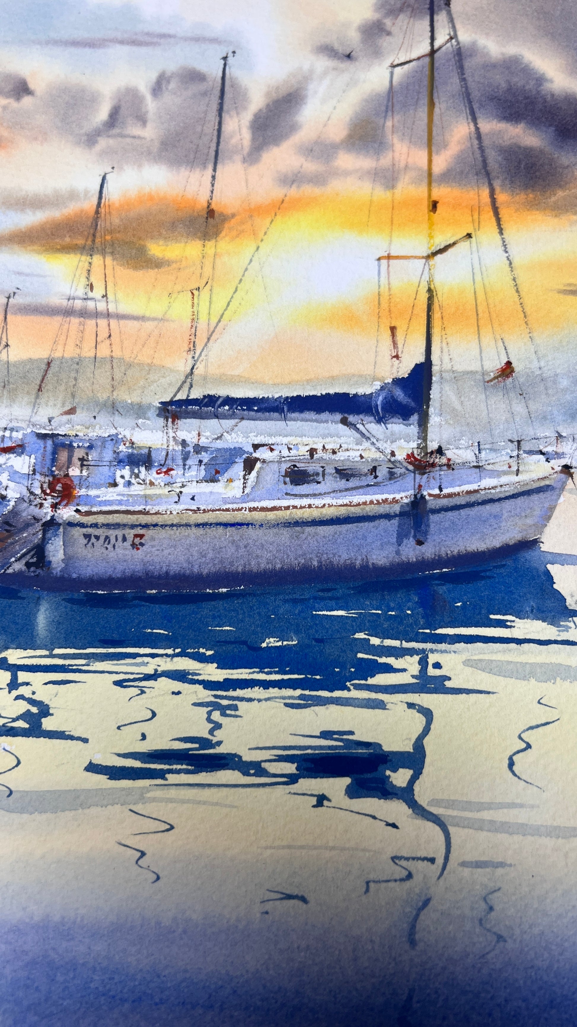 This painting is a masterclass in watercolor technique, specifically the "wet-on-wet" approach used to create the soft, glowing clouds. The sharp details of the sailboat masts provide a striking contrast to the atmospheric background. The reflection of the sunset on the rippling water is rendered with exceptional skill, making the entire scene feel alive. A must-have for those seeking to add a touch of maritime drama and color to their art collection.