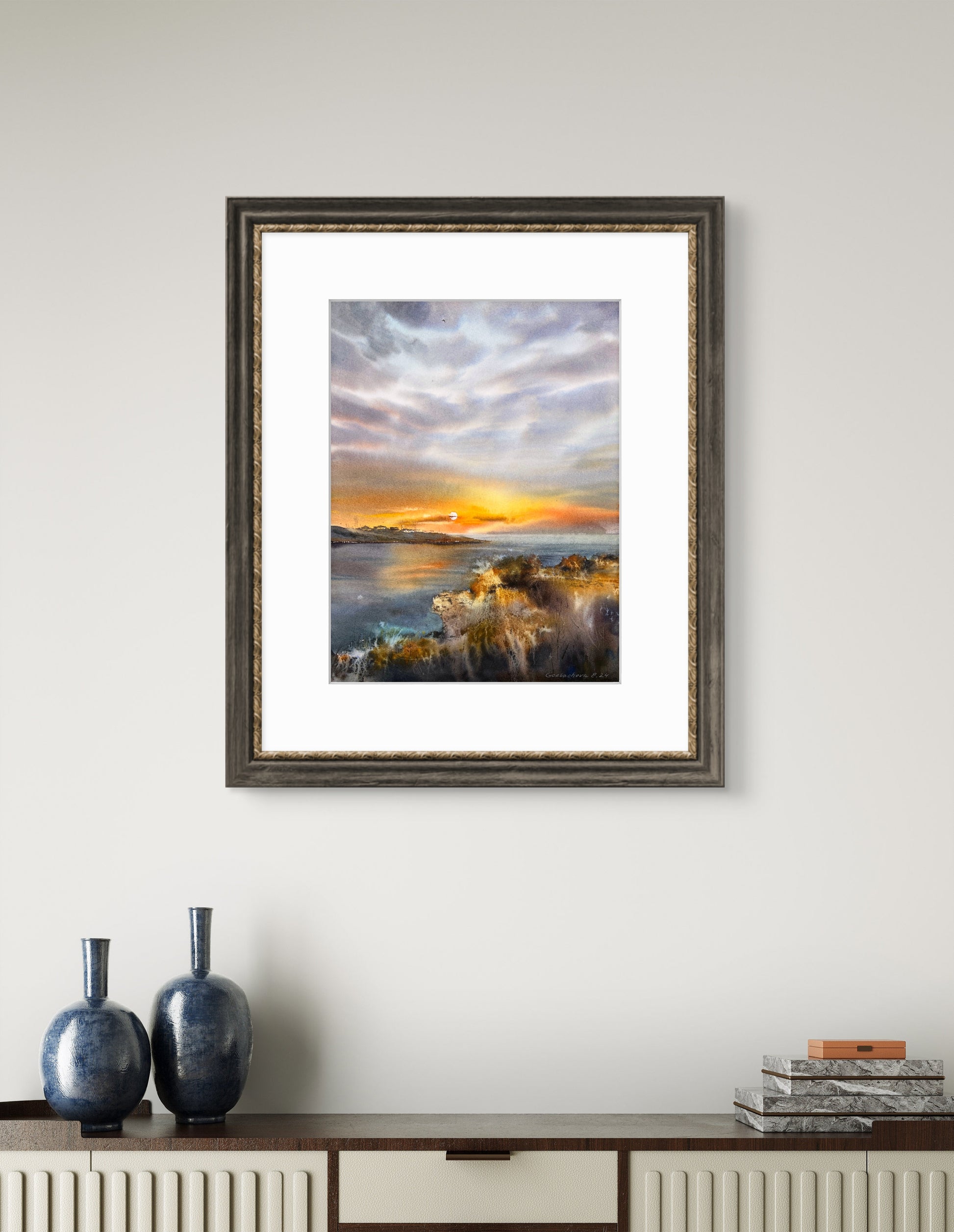 Immerse yourself in the serene beauty of a coastal sunset with "Sunset Romance," a one-of-a-kind watercolor original that captures the essence of a tranquil village by the sea as the day draws to a close. Each brushstroke tells a story of love and serenity, making this piece an enchanting addition to any art collection and a thoughtful art gift for her.