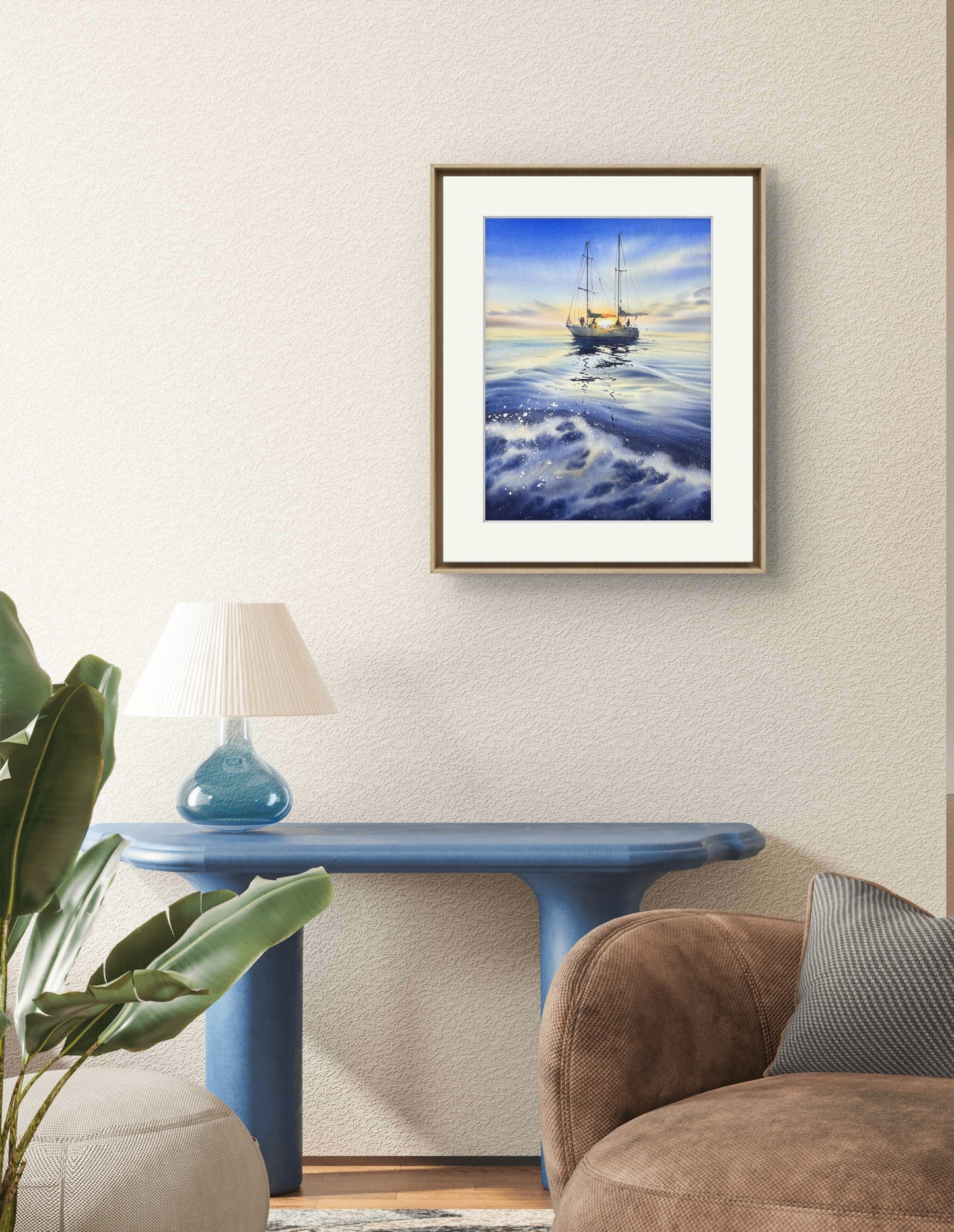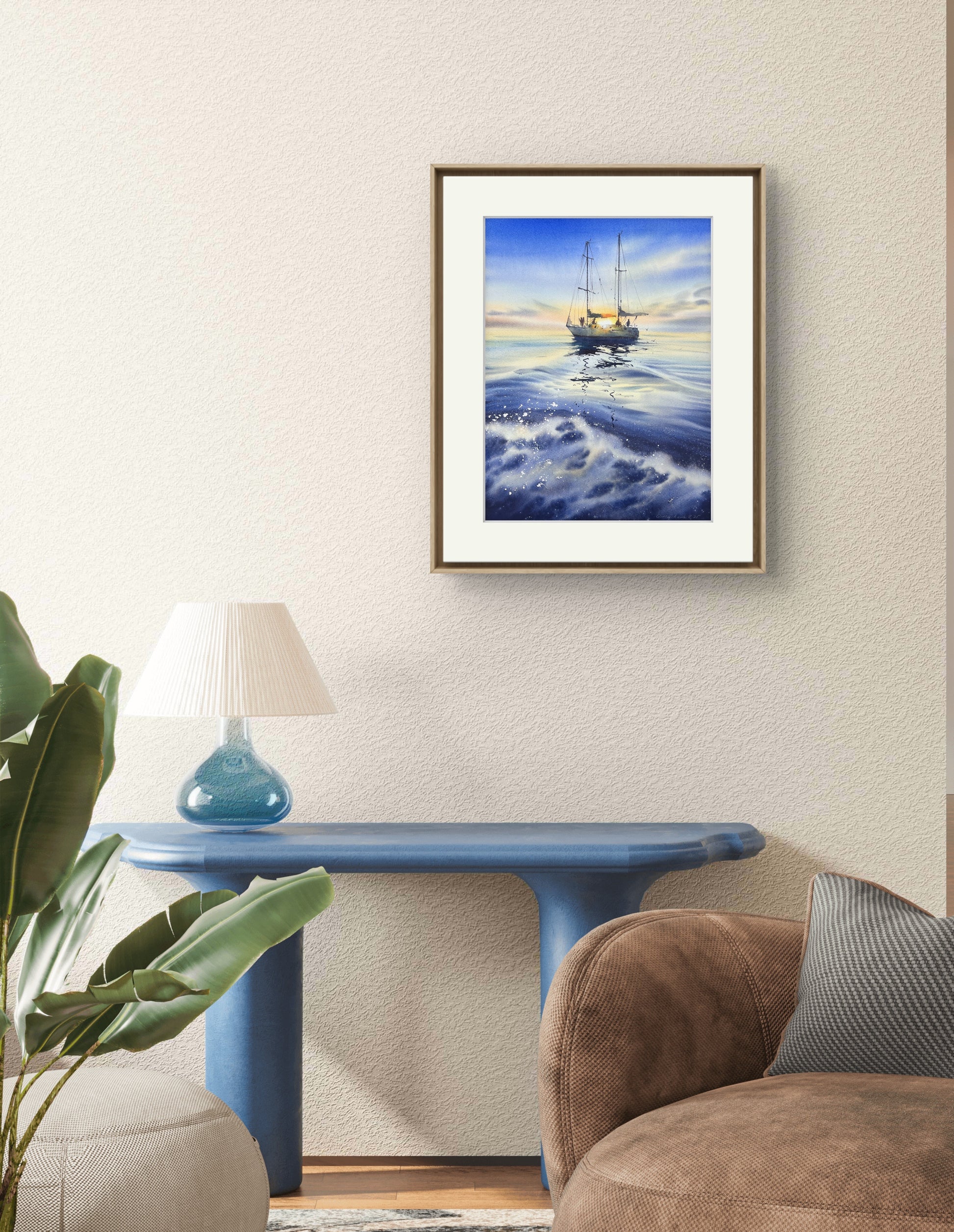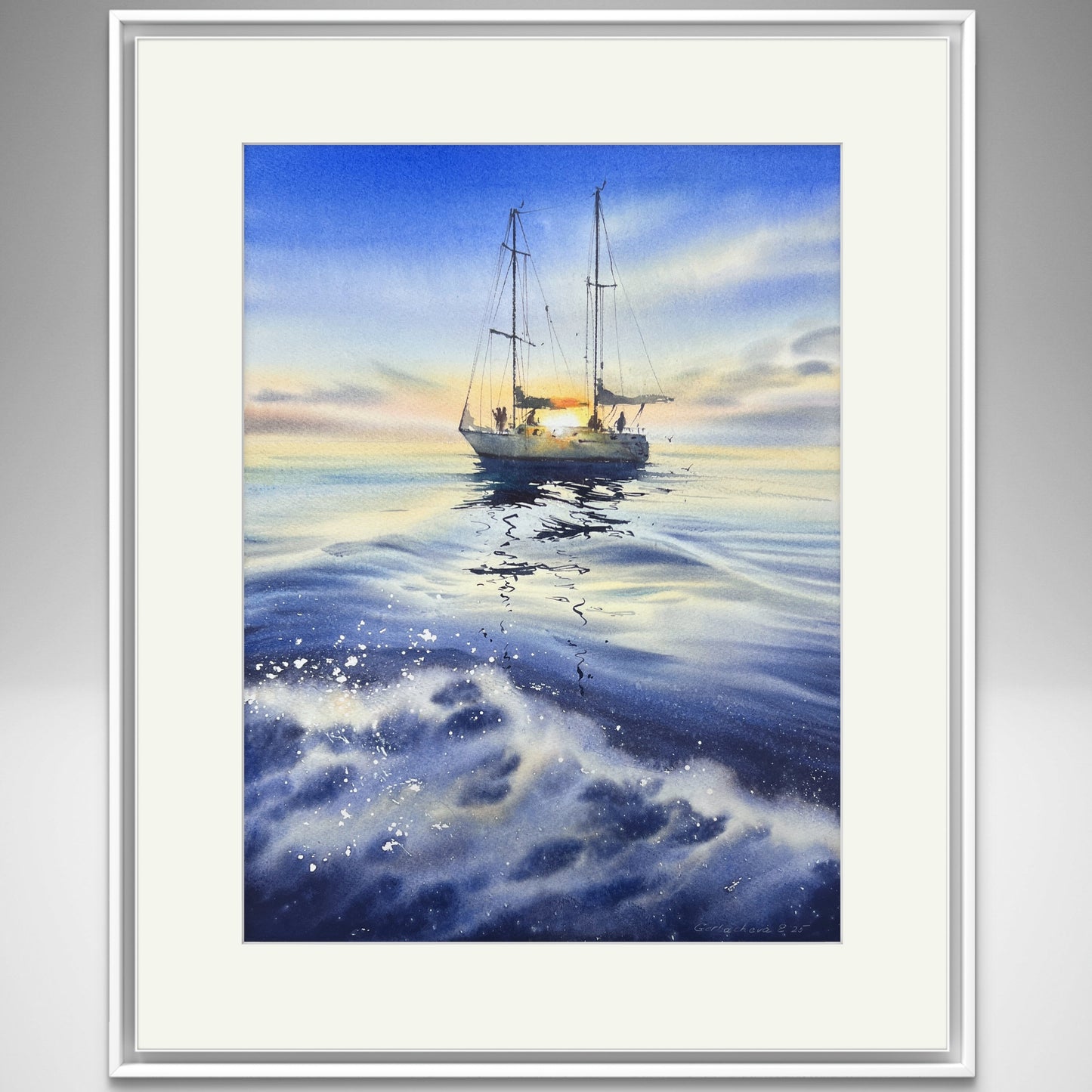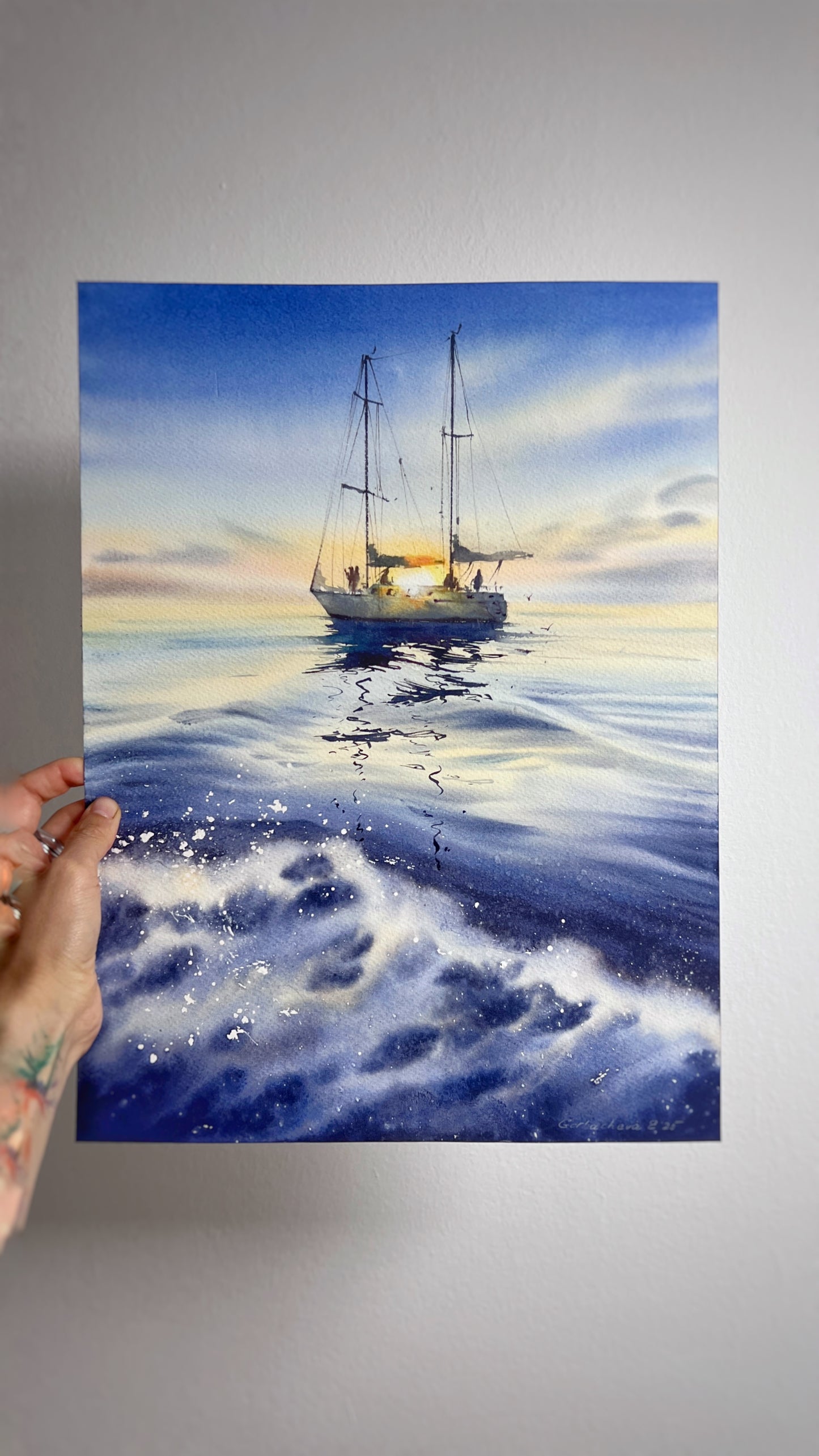 Each stroke of this watercolor painting is created with meticulous care using professional-grade pigments, ensuring vibrant colors that will last over time. The blend of blues and yellows evokes a peaceful maritime atmosphere, ideal for fans of coastal and marine-inspired art. This unique piece also makes a distinctive gift for him — whether for birthdays, Father’s Day, or simply to add a touch of calm elegance to his space.