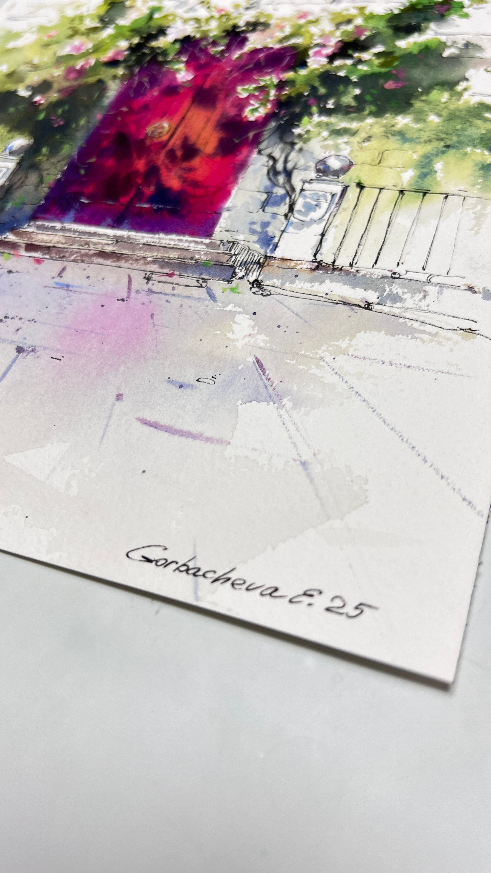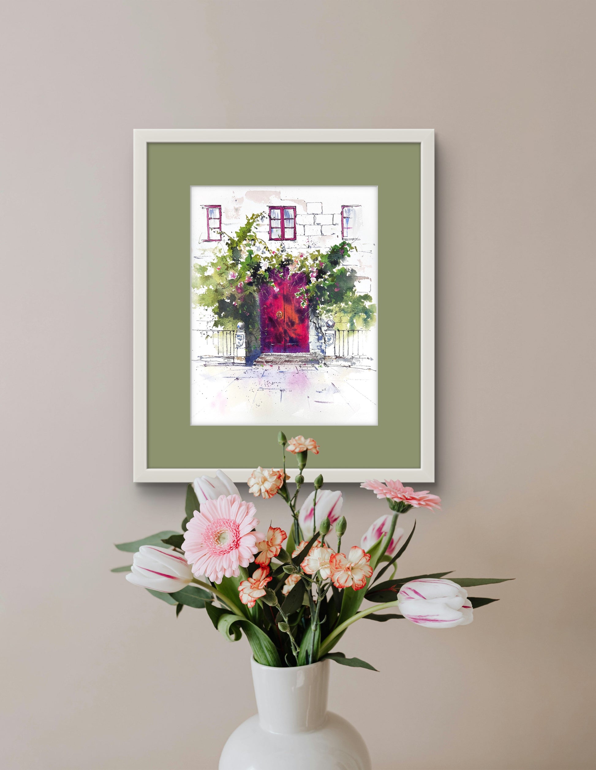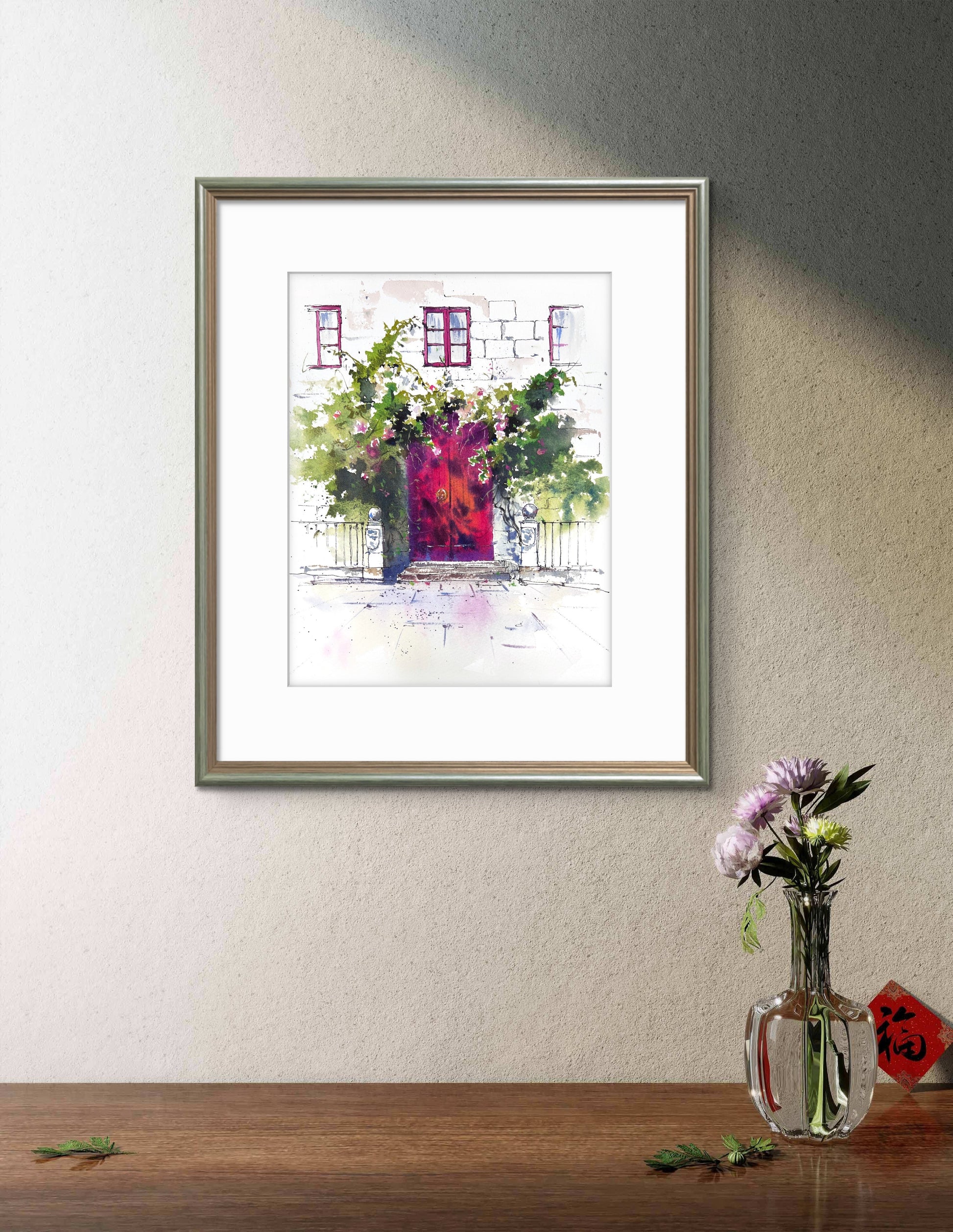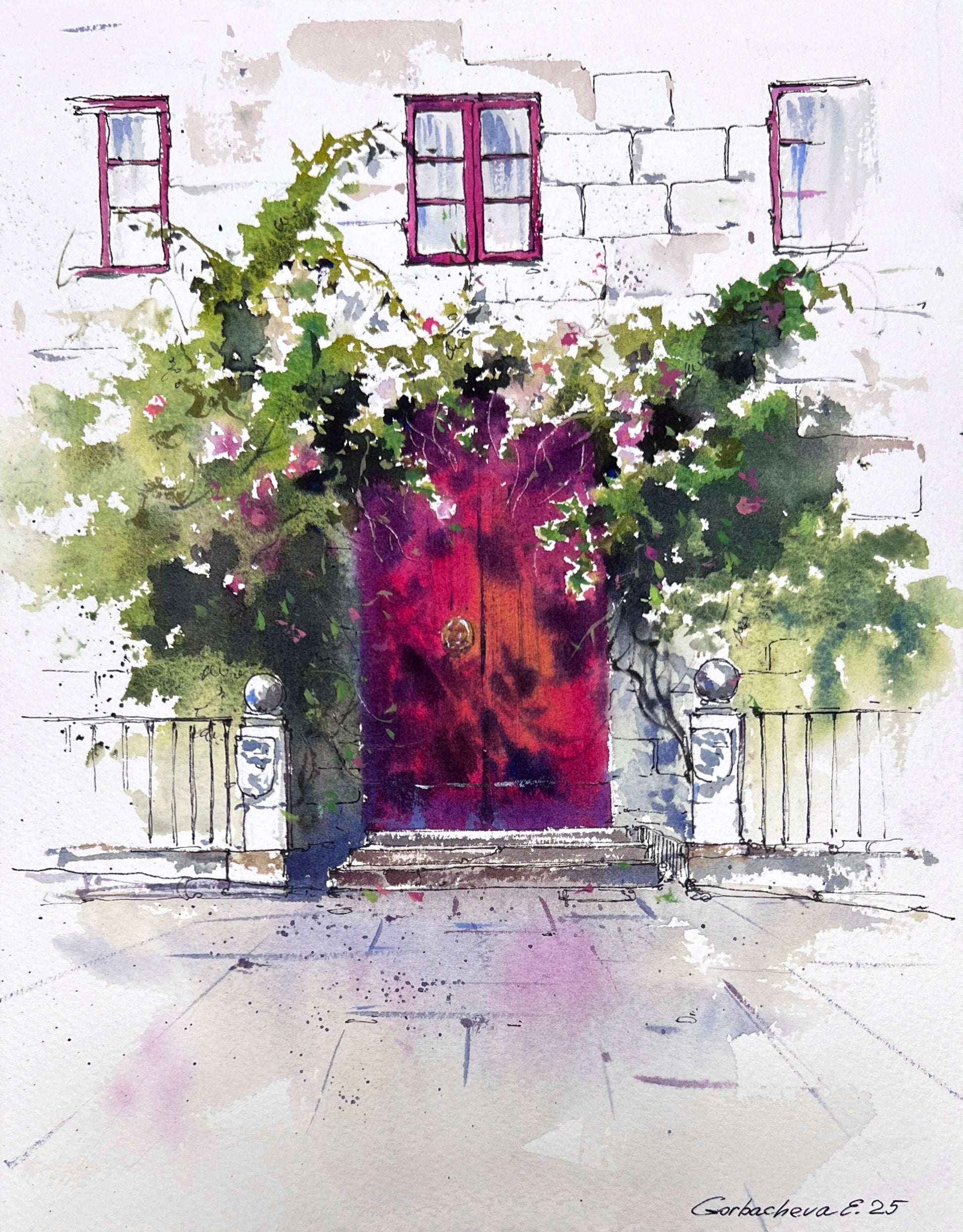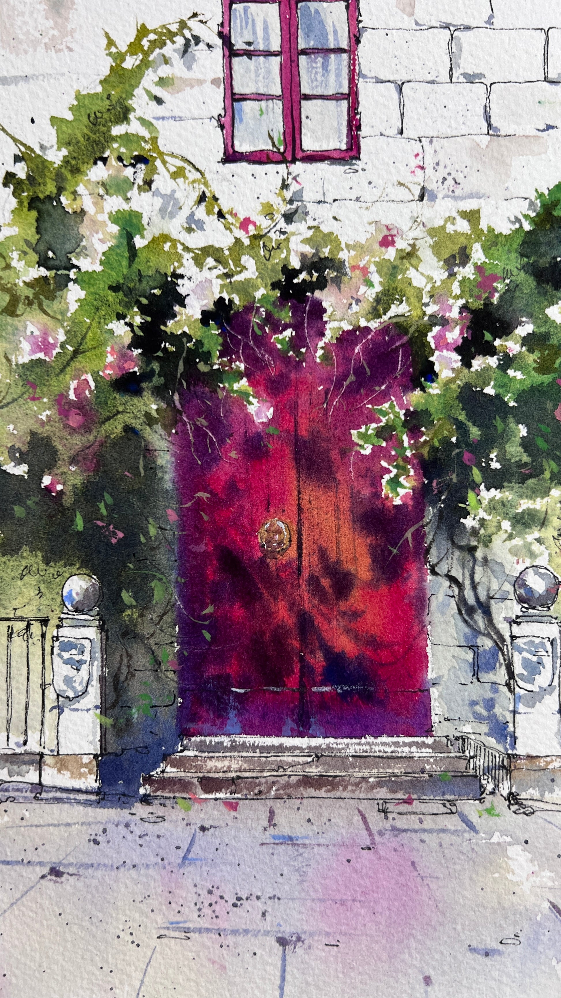 This evocative watercolor artwork transports you to a quiet, charming street in Spain. The focal point is a rich, colorful magenta door, beautifully contrasted with white stone and an abundance of wild, climbing greenery. The loose, expressive style of the watercolor captures the light and vibrancy of a Mediterranean summer.