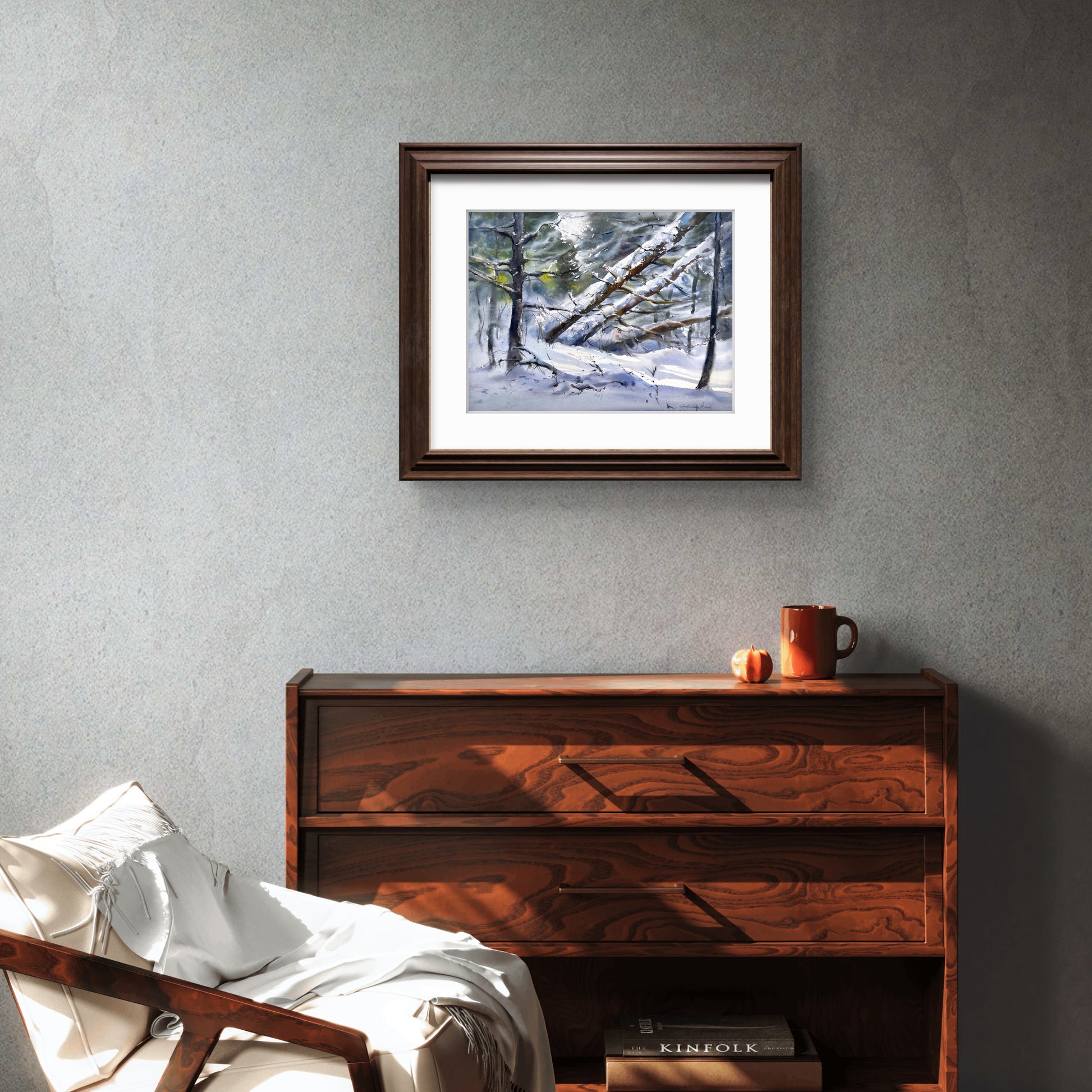 Watch as the winter sun transforms the forest into a shimmering gallery of light. This watercolor study focuses on the textures of bark and the brilliance of sunlit snow. The loose, impressionistic style allows the viewer's imagination to wander through the pines. Its neutral yet vibrant palette makes it versatile for any room. Enhance your gallery wall with this authentic piece of fine art that celebrates the quiet majesty of the winter season.