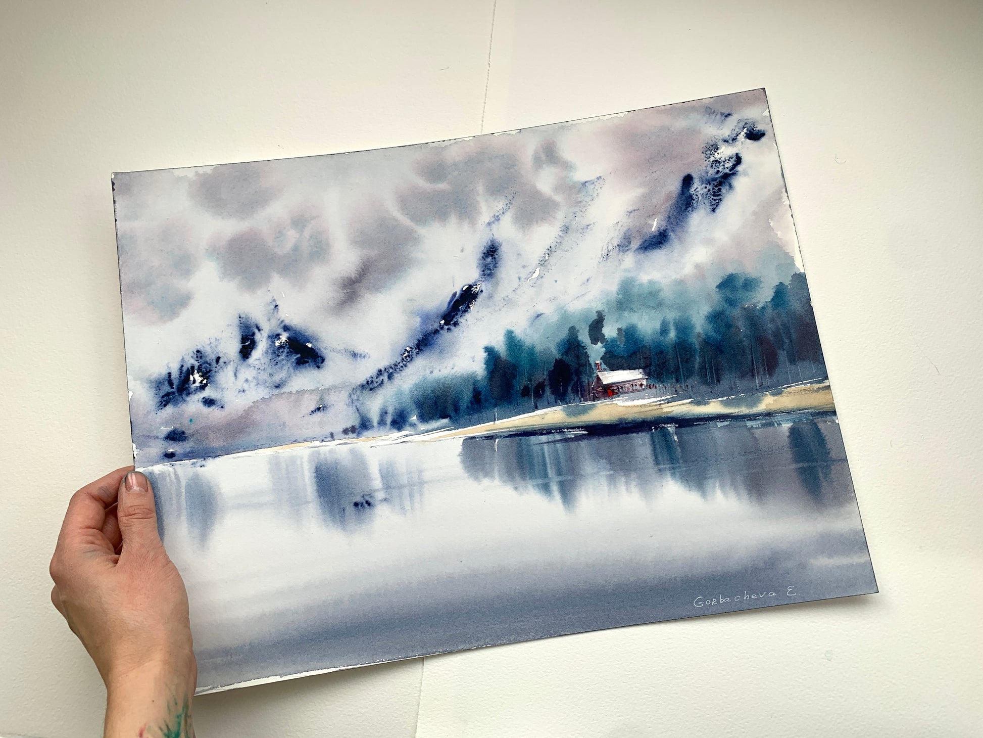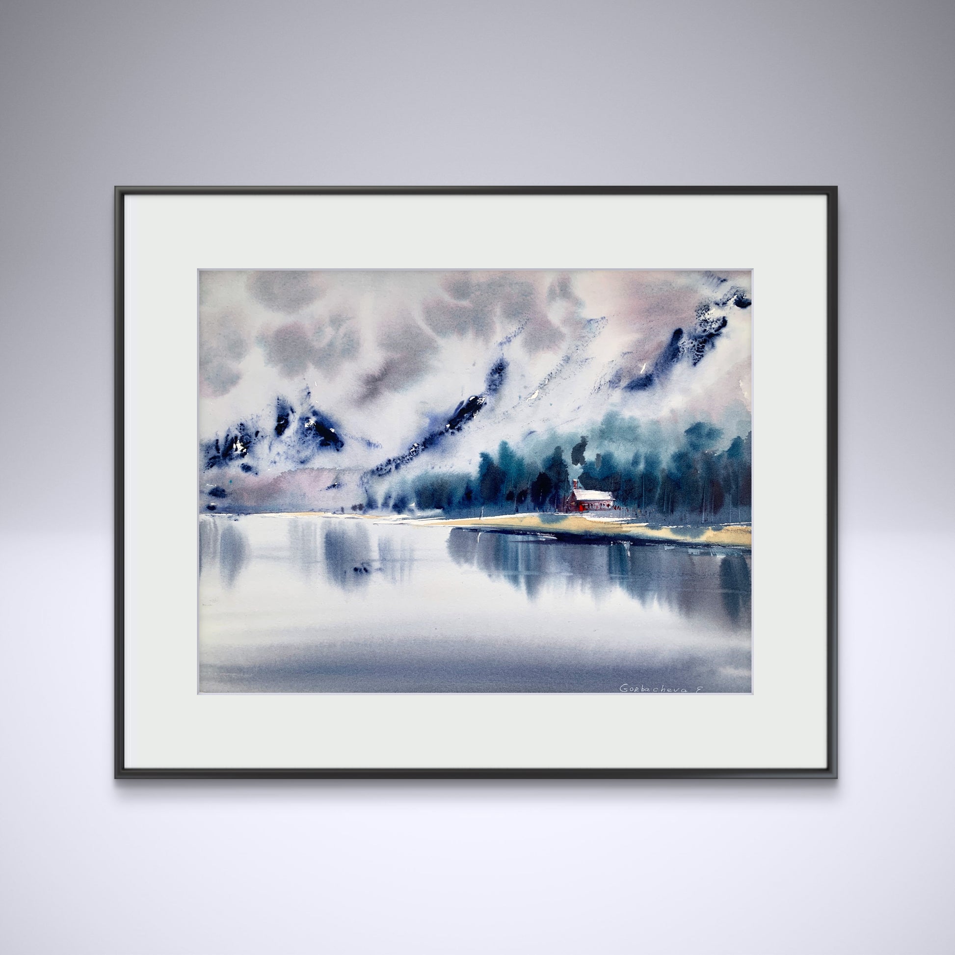 Bring the serene beauty of a winter forest into your home with this original watercolor painting. Featuring a charming red cabin tucked away among snow-dusted pines, this piece captures the quiet magic of a frosty morning by the lake. The soft blue and grey palette creates a calming atmosphere, perfect for a cozy living room or bedroom. Whether you are looking for a unique Christmas gift or a seasonal update for your gallery wall, this atmospheric landscape evokes peace and winter wonder.